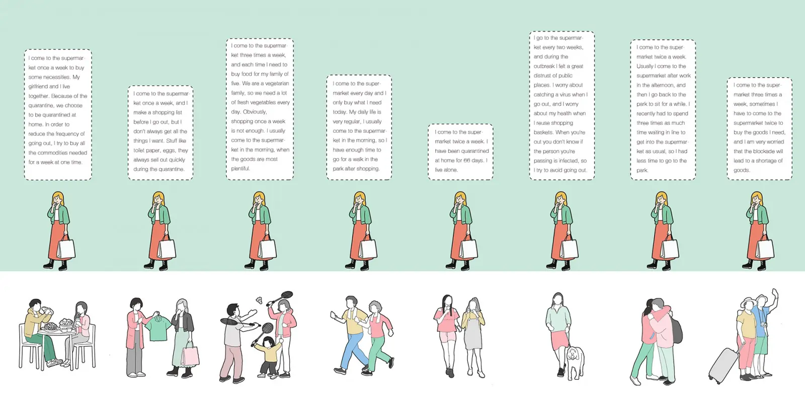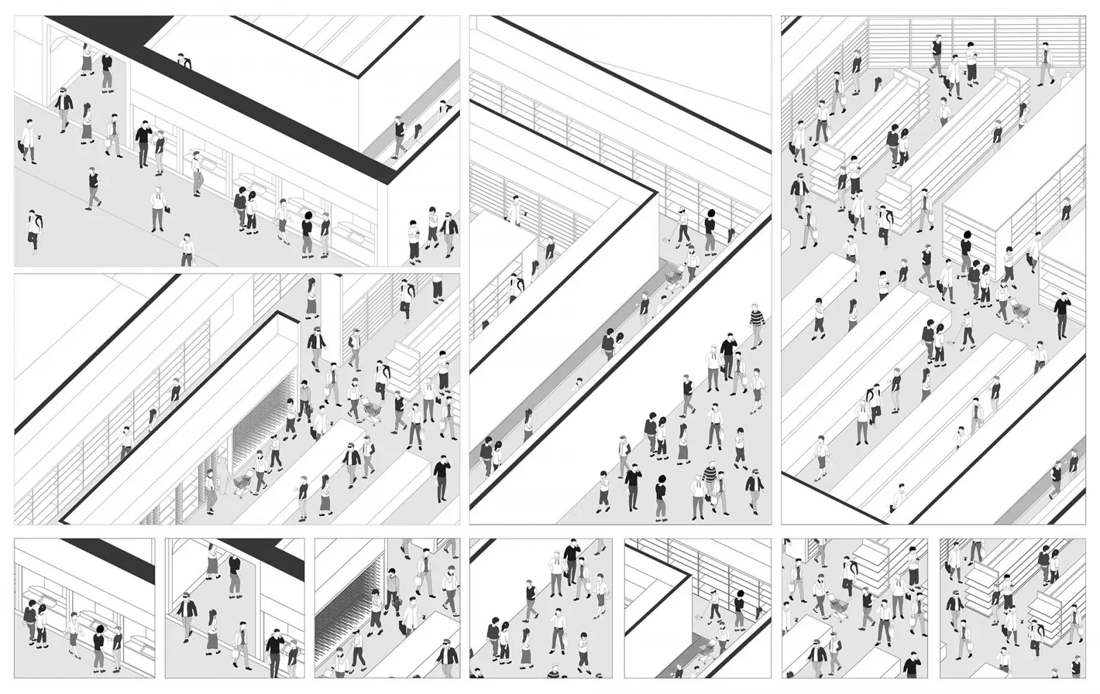 Supermarkets meet people’s physical and mental needs during quarantine. We may have to live with viruses for a long time, and how to stay connected to others and society is the challenge to embrace. The design responds to the existing social phenomena and provides a possibility for dealing with social distancing in the future retail industry.