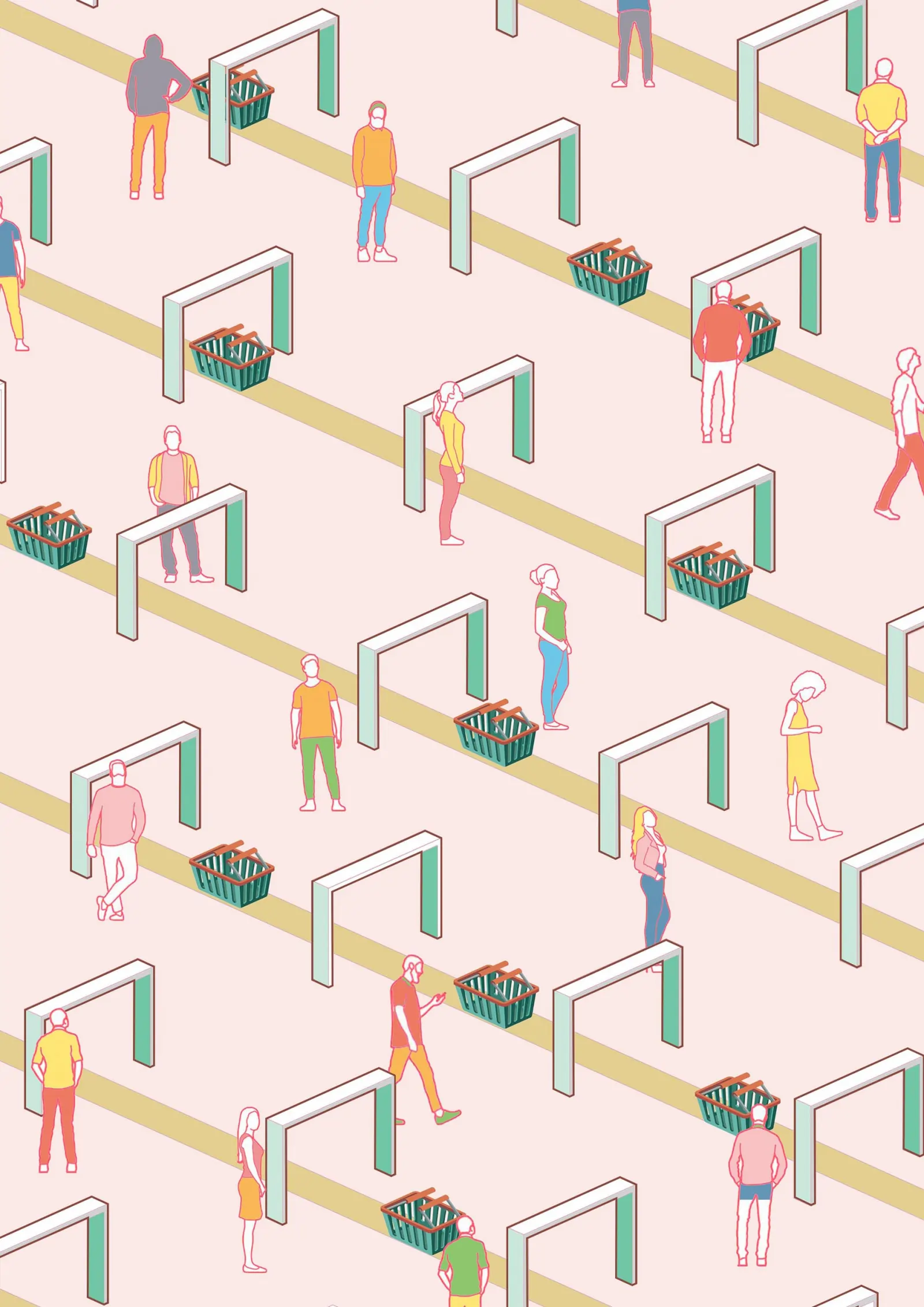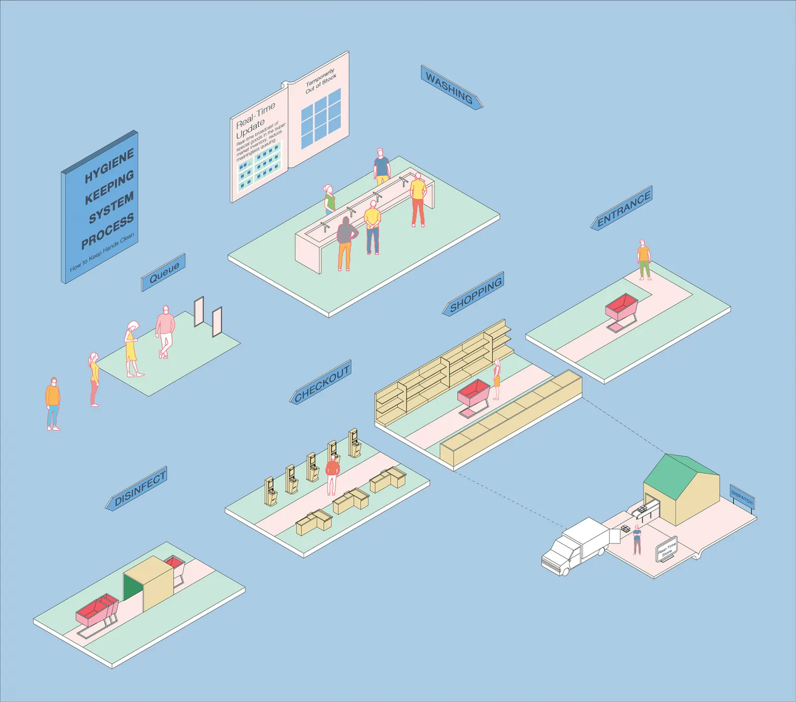Shopping is severely challenged during COVID-19, which greatly affected our behaviour and psychology. My grocery shopping in the supermarket downstairs inspired me. Everyone in the queue was trying to keep 2 meters distance. When the security guard passed by, the woman in front of me asked: “Are there any eggs left?” It’s so crowded and I waited for 15 minutes just to buy a box of eggs. 20 minutes later, I entered the supermarket and continued with the social distance. I was relieved when I stepped out of the supermarket. There was still a long queue…... So I decided to design a supermarket providing safe and enjoyable shopping experience. Since frequent hand washing helps a lot, how do we incorporate this in a daily routine within this context?