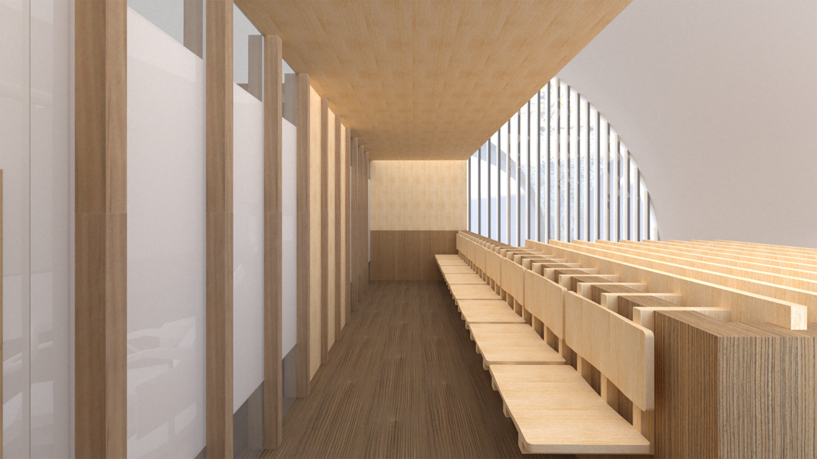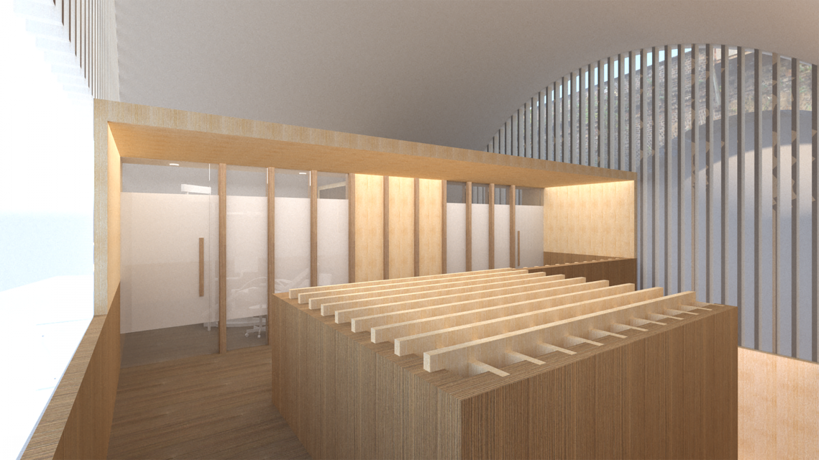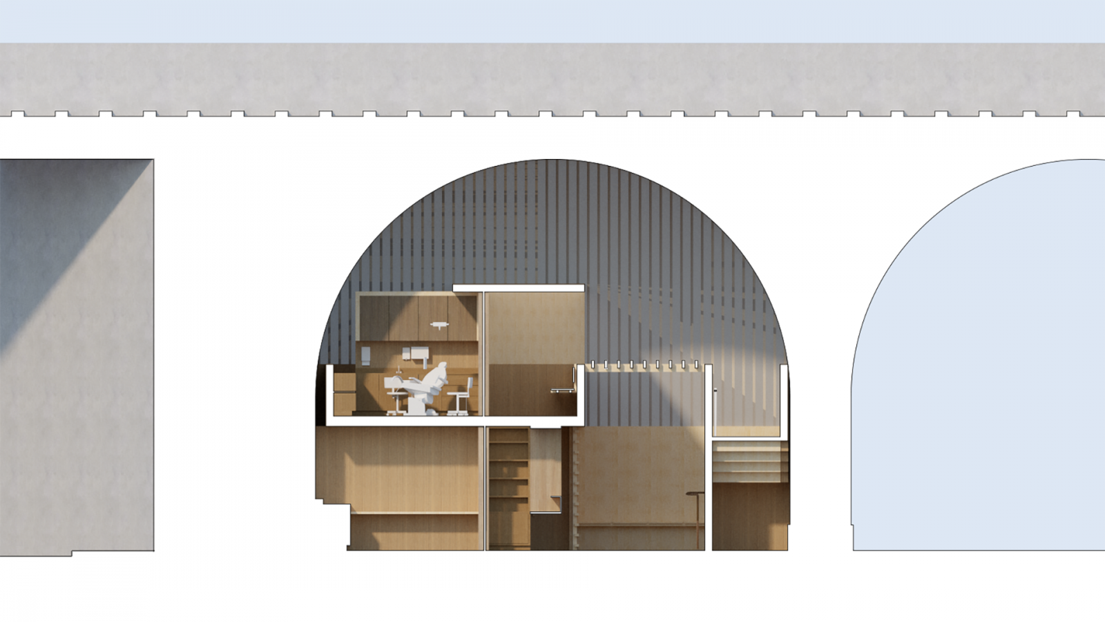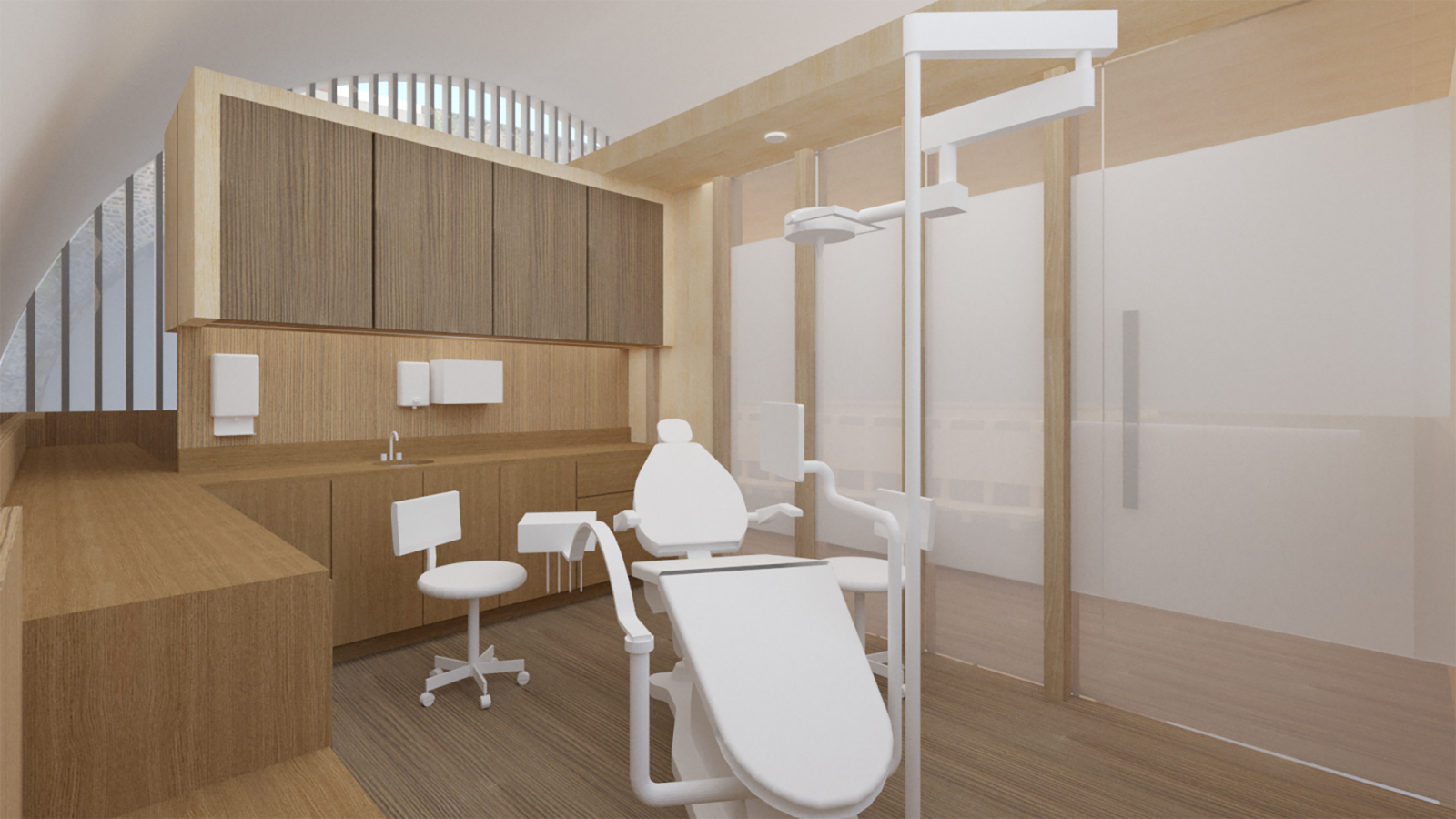 This interior proposal’s main objectives are to address issues that are often to be found in NHS dental practices including; poor circulation / spatial adjacencies, rather cluttered environments and an institutional ambience. When brought together these things do little to put patients at ease in a place where people are often anxious. In response to this the interior aims to create an environment that is systematic, clean and tidy whilst also providing comfort and warmth for the user. To achieve this the existing arch has been given a clean white lining before a beautifully crafted timber interior has been installed within the double height volume. Ash, American oak, teak and dark walnut timbers are used to create a quality interior in which both the smell and acoustic quality of the wood will delight the senses and help instill a feeling of calm on the building’s users. Vertical timber louvers help to introduce, control and modulate natural light to further enhance a feeling of wellbeing within the space. A clean modern aesthetic contributes to establishing an interior that is efficient and organised but also accessible and friendly.