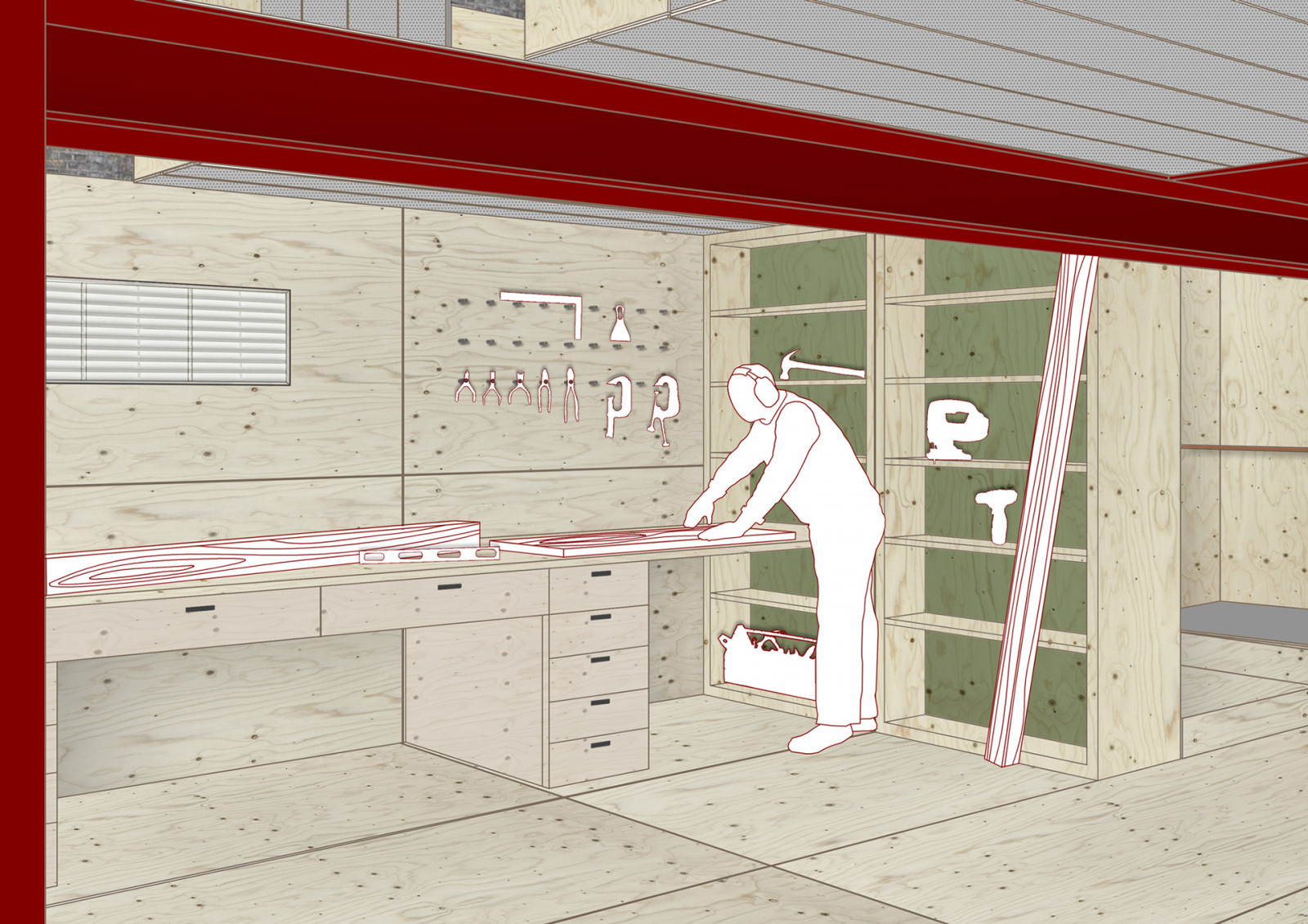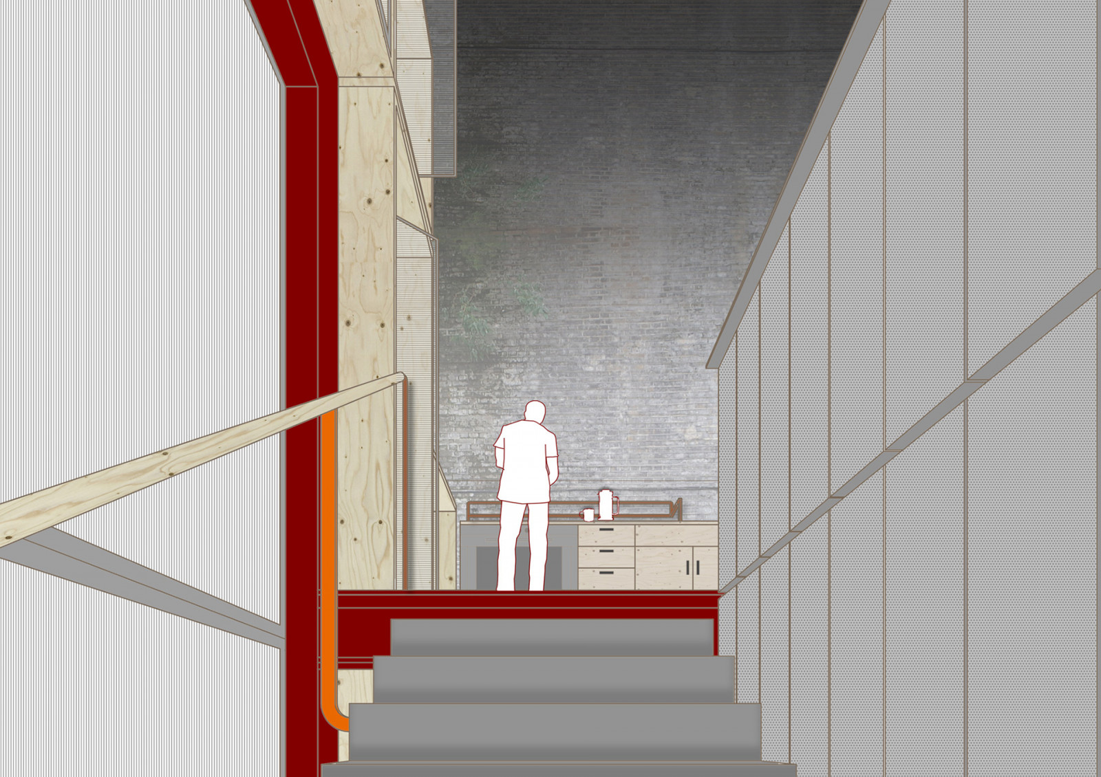 The interior inserts a plywood ‘tray’ to the ground floor to create the barrow repair workshop whilst a metal and plywood mezzanine forms the living space above. Humble, functional and ordinary materials have been thoughtfully detailed and a number of kinetic elements provide extraordinary spatial moments. Inspired by the moveable nature of the market barrows both storage cabinets and façade panels move to reconfigure the interior whilst the mezzanine can be positioned to the inside or slide outside to enable ‘John’ to enjoy a balcony view of the new market place at the end of a long working day.
