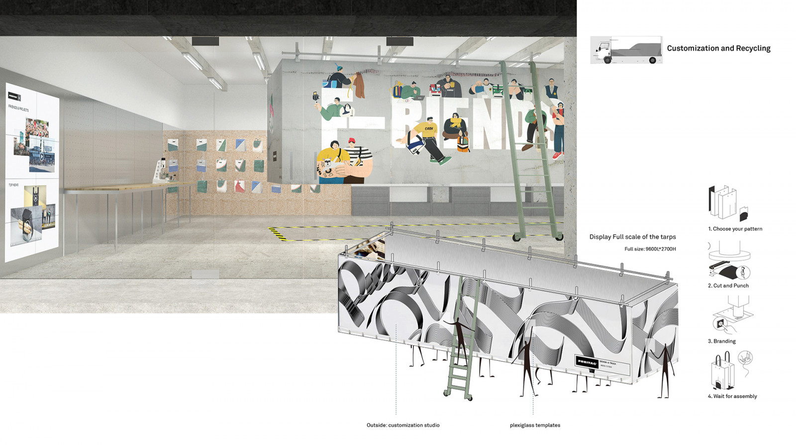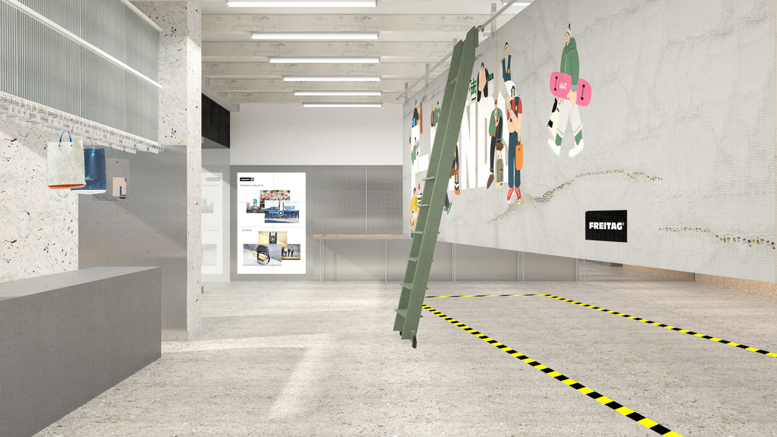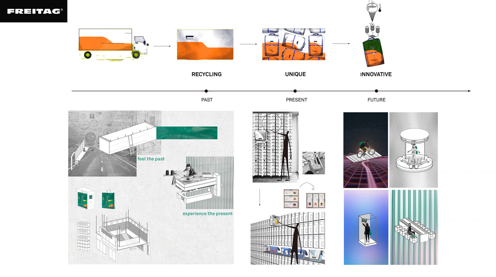 The design concept is about time; old and new, past and future. Each of FREITAG’s unique bags is made from recycled truck tarp, and every piece of their clothing can degrade in the soil over time, they waste nothing but time. To represent the spirit of the brand, we will not only let guests experience what FREITAG has now; unique materials, handmade process and a wide variety of products but also display FREITAG’s future social role as a sustainable and innovative brand.
