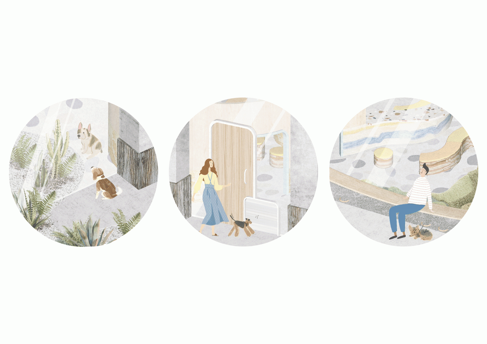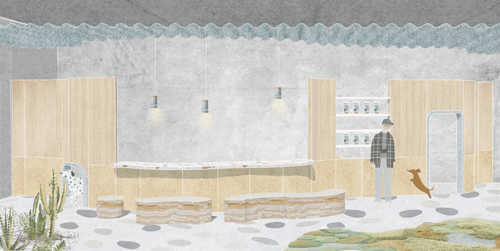 Rather than creating a dog-proof space - hard, shiny, and wipeable - Pawfee embraces the destructive nature of dogs. The finishes are designed to deteriorate in a beautiful manner. The appearance of the space is enhanced through dogs’ rough and tumble play, chewing and scratching. Designed following circular economy principals, the wall panels and furniture can be recycled or renewed as required.
