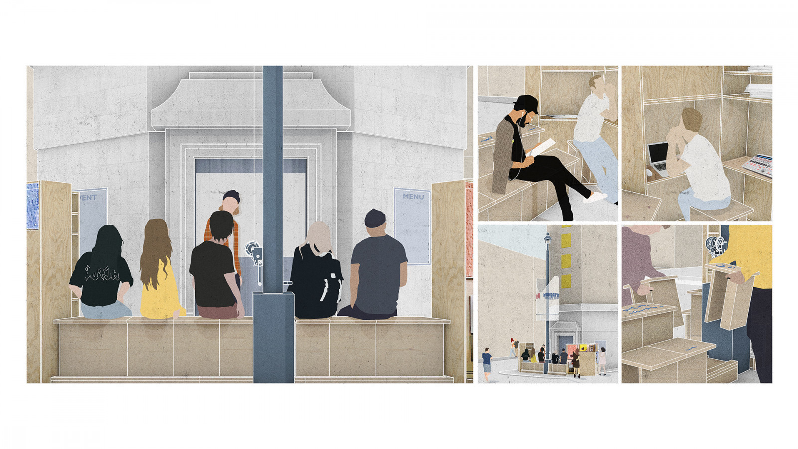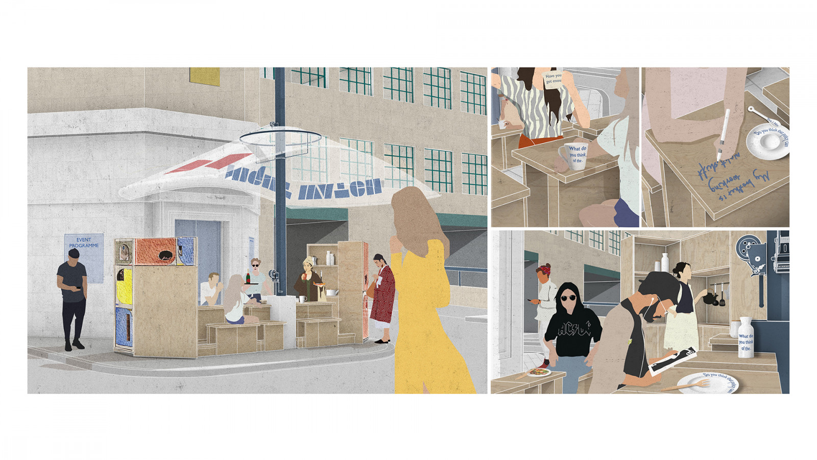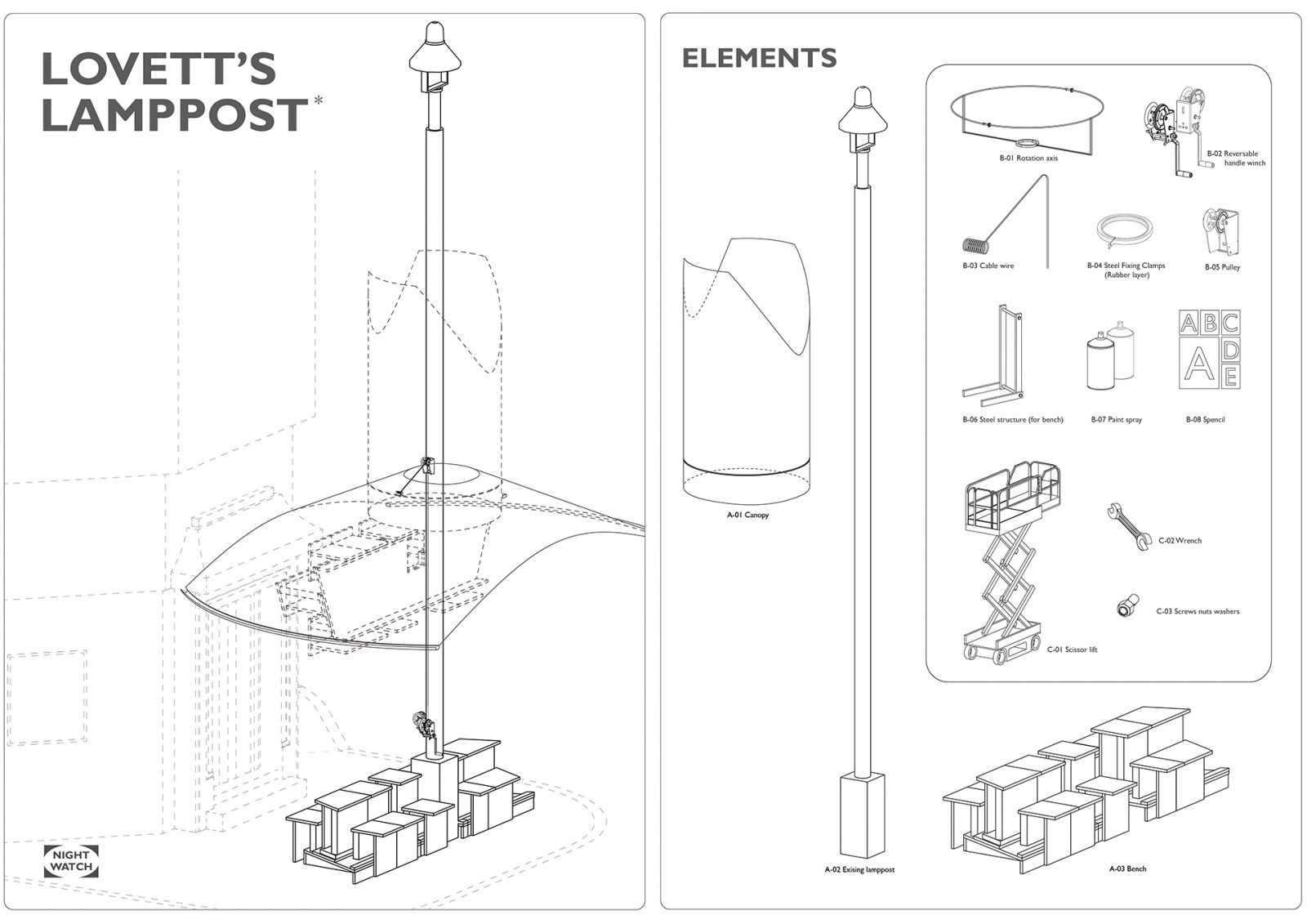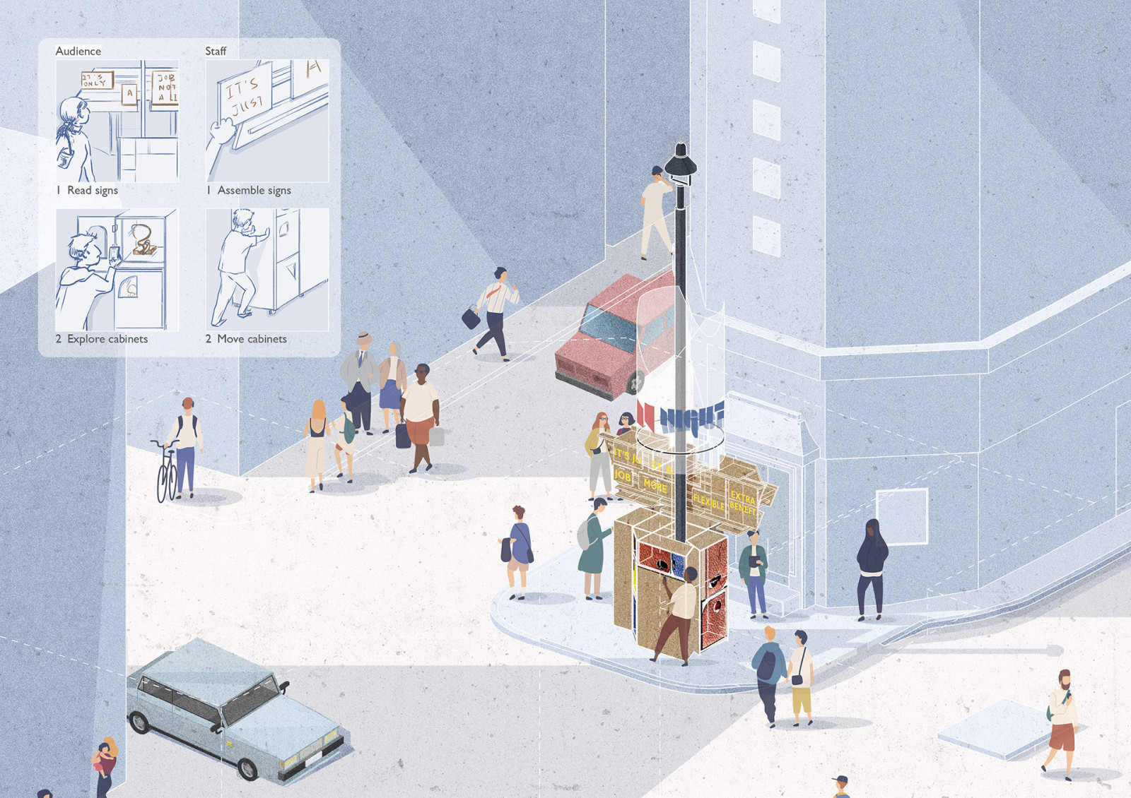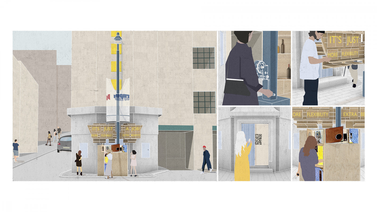 Furthermore, the entire project operates as a ‘Spatial Demonstration’ in this public space. All parts of this structure will carry and convey messages about night-time workers. Cabinets of curiosity will embody a series of artworks related to the issues they are facing; the seating area records the thoughts of everyone who has visited and the interchangeable sign demonstrates the core issues they would like addressed.