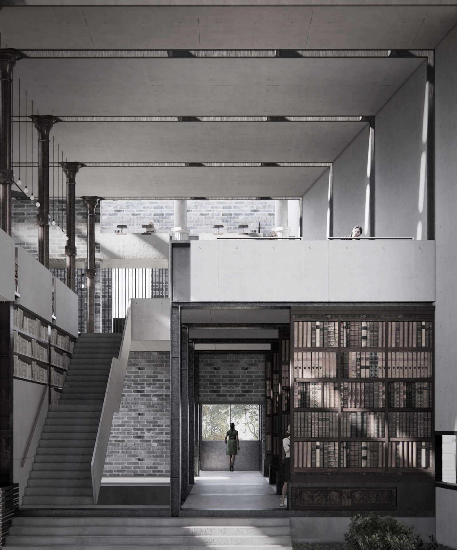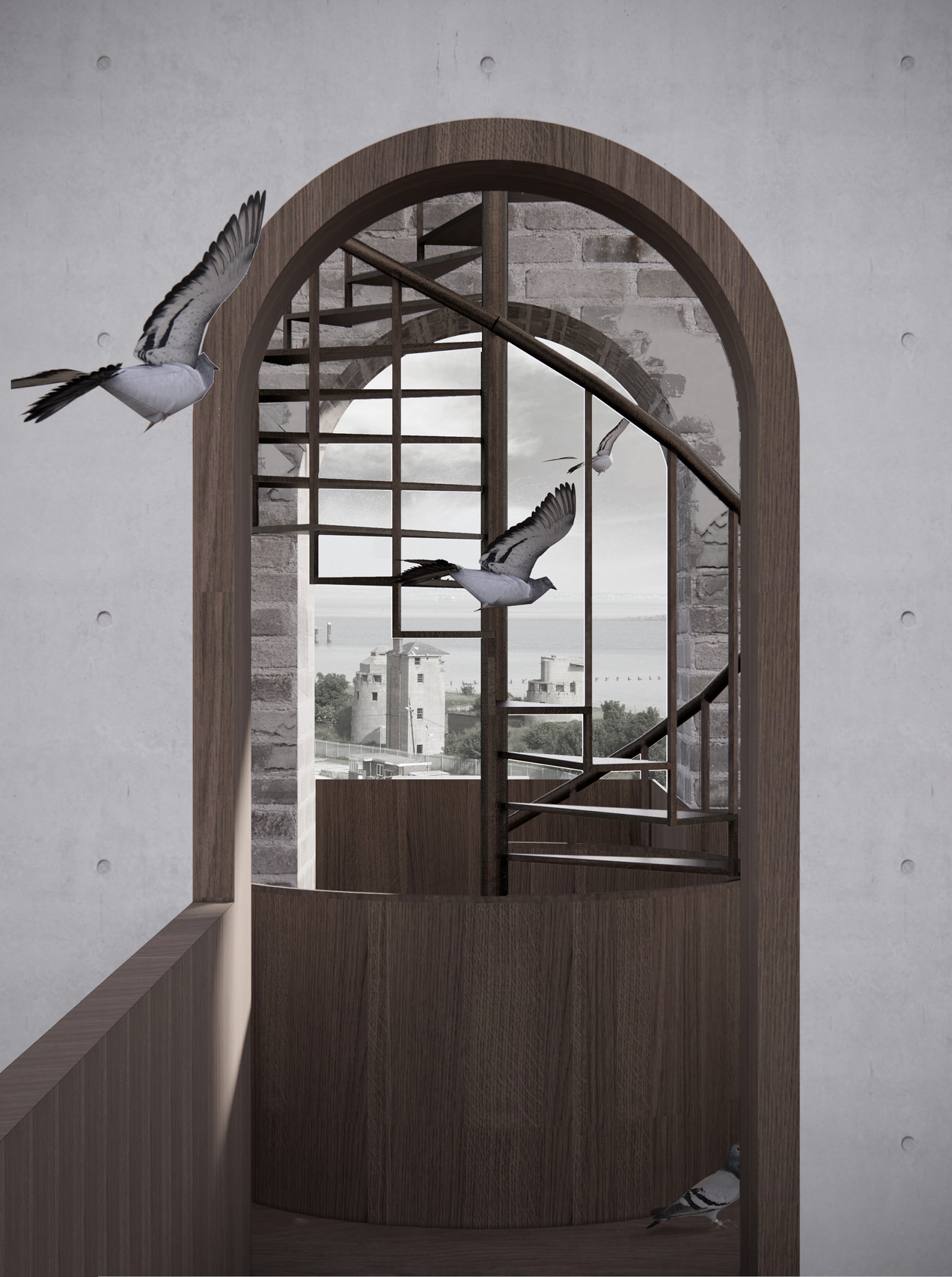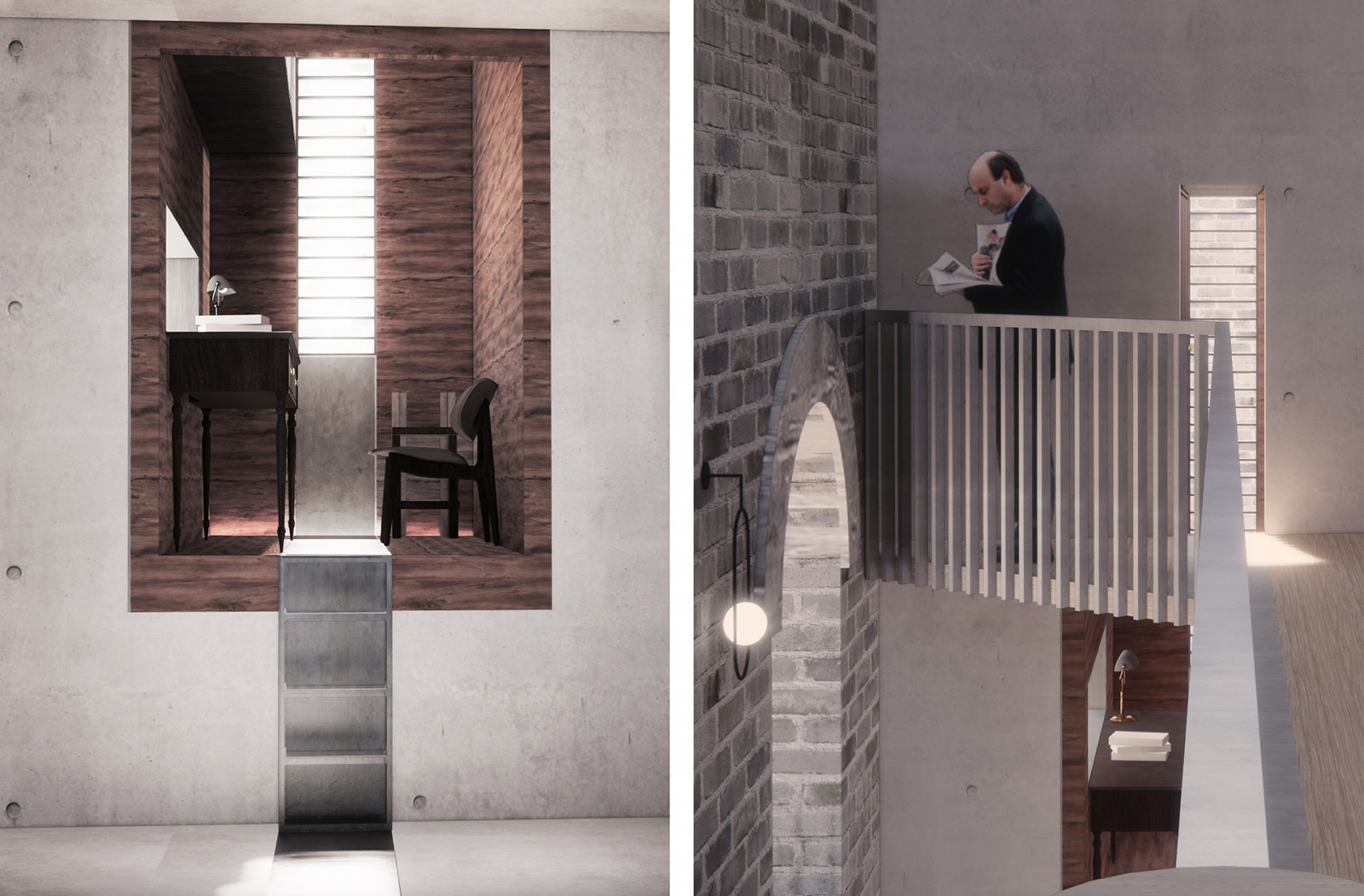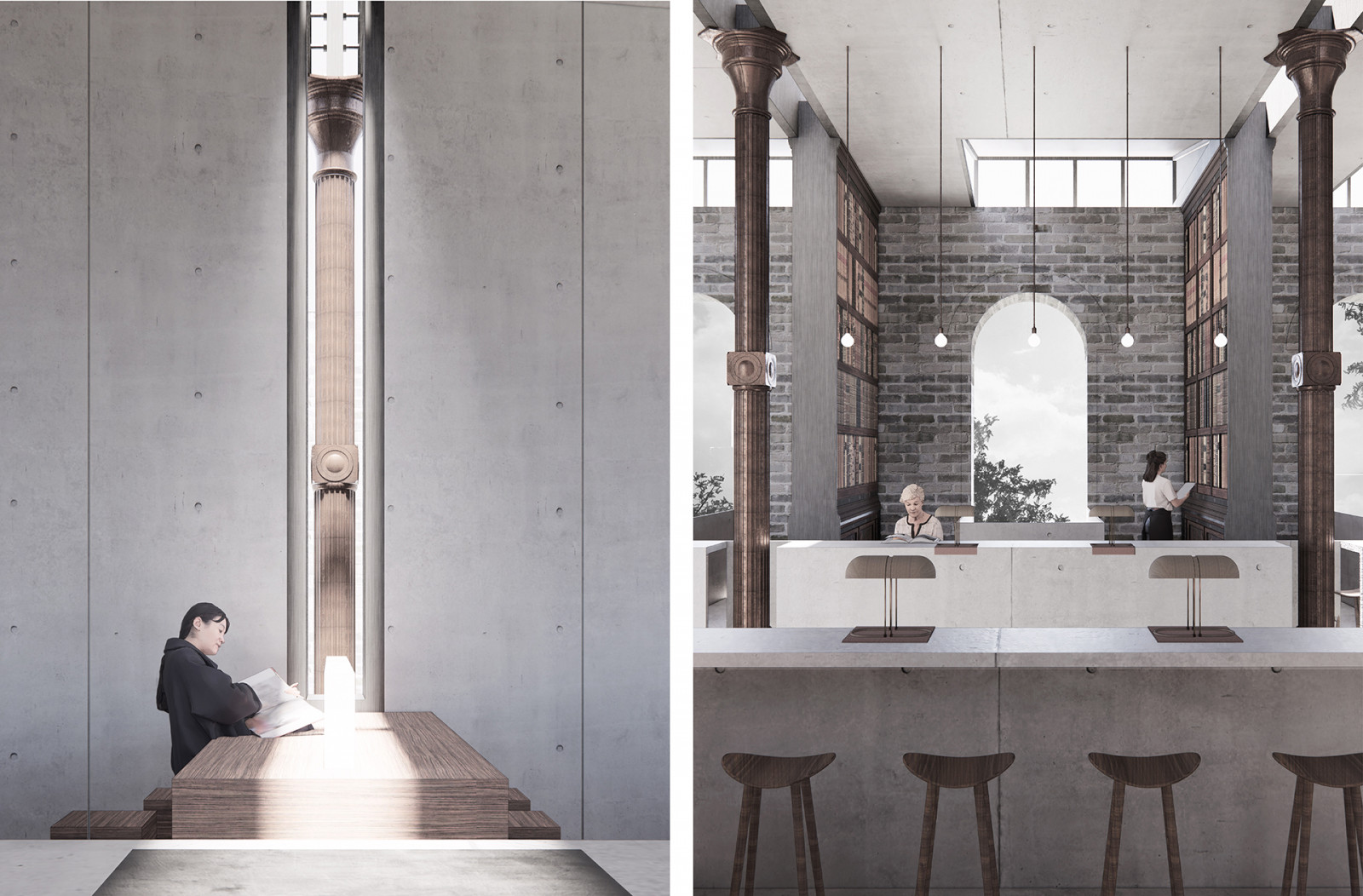 This journey leads to the first and most dramatic intervention into the building; a direct path that shears off the terrace-edge of the church and creates a new route through the side of the archive. This ambiguous space, neither inside nor out, does three things; it connects the memorial directly to the building and an old forgotten path to the docks, which will be reopened with this project. It exposes the old structure of the building; a symbol of its past and future. And, it creates a new connection to the garden, accessed once the corner is turned and the visitor moves towards the sea. From this point visitors enter the archive and can participate in a quiet, industrious space, where they can look up family-trees, read books, and immerse themselves in the peoples histories.