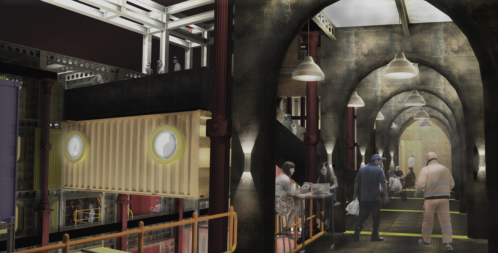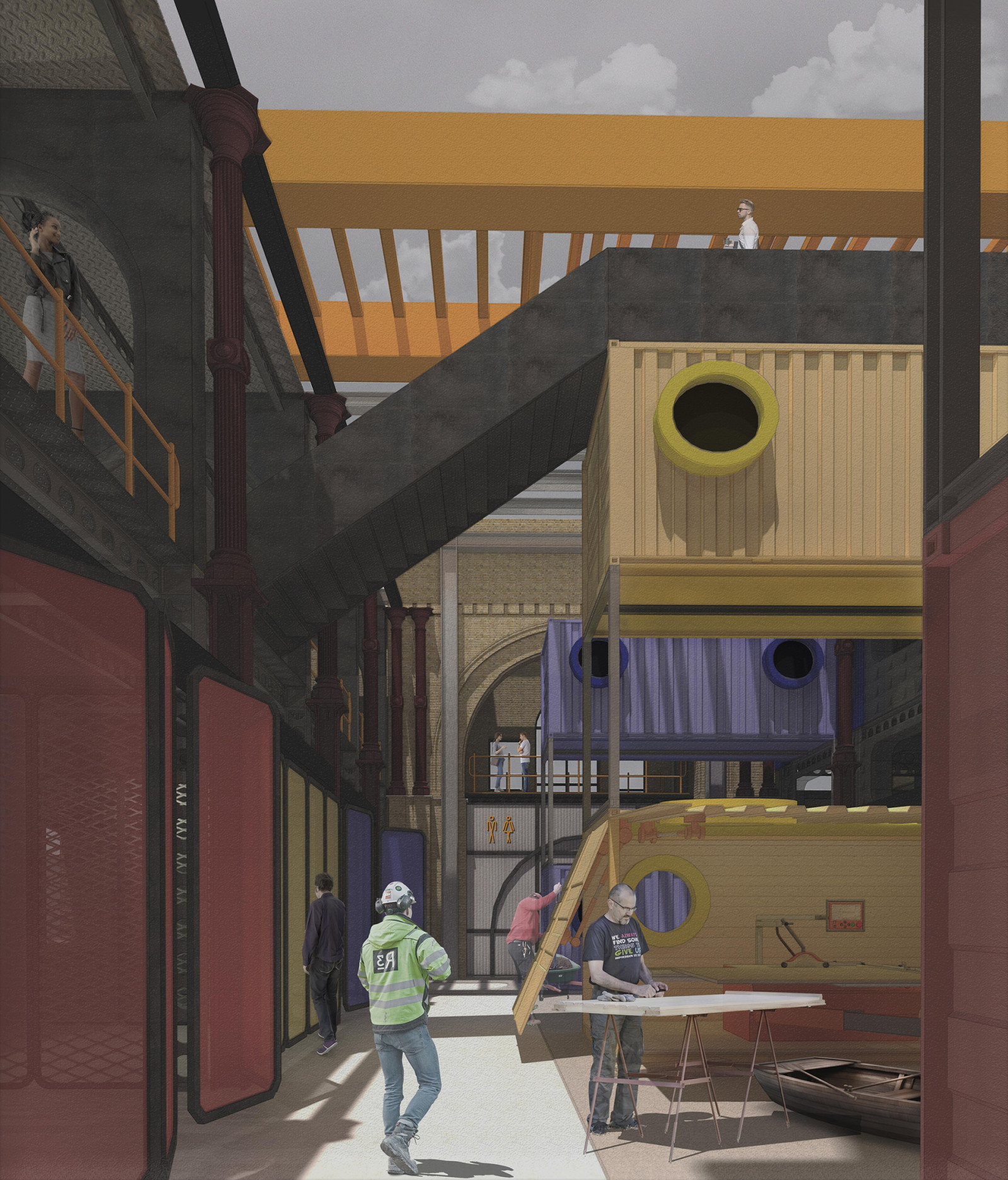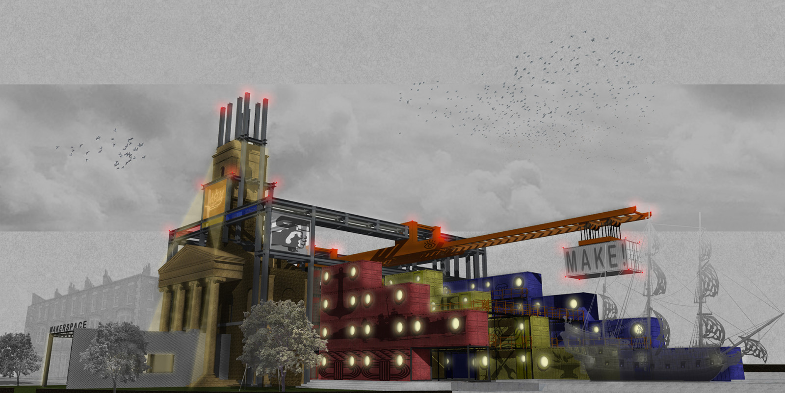 The makerspace is a flexible place that grows and shrinks in relation to the needs of the local economy. This is emphasised in two ways. The makerspace is organised as a mini-port; full of containers that hold studios and workshops. Secondly a huge-gantry crane redeploys the shipping containers, as and when they are needed. Its steel structure reinforces and restructures the existing building.