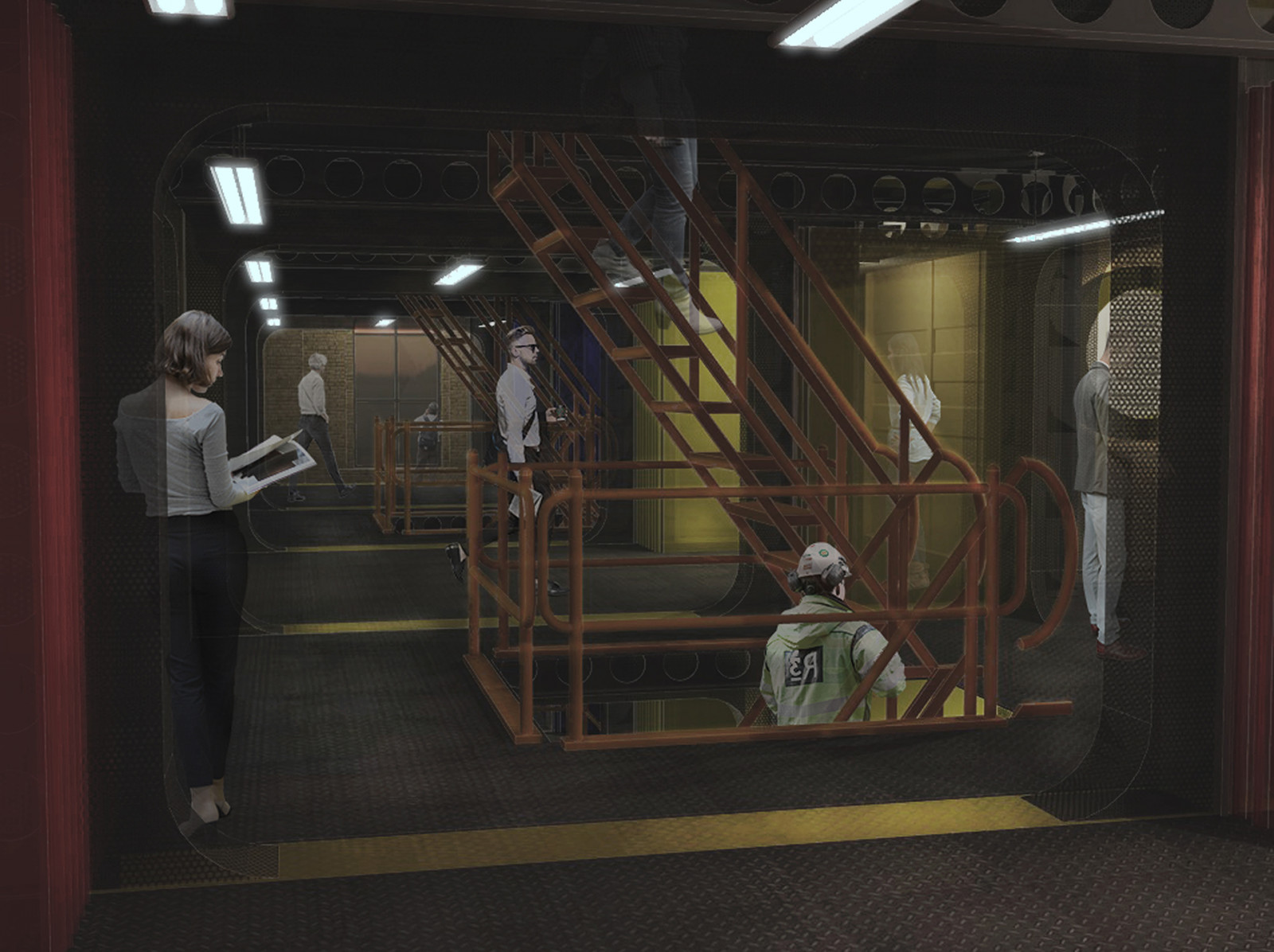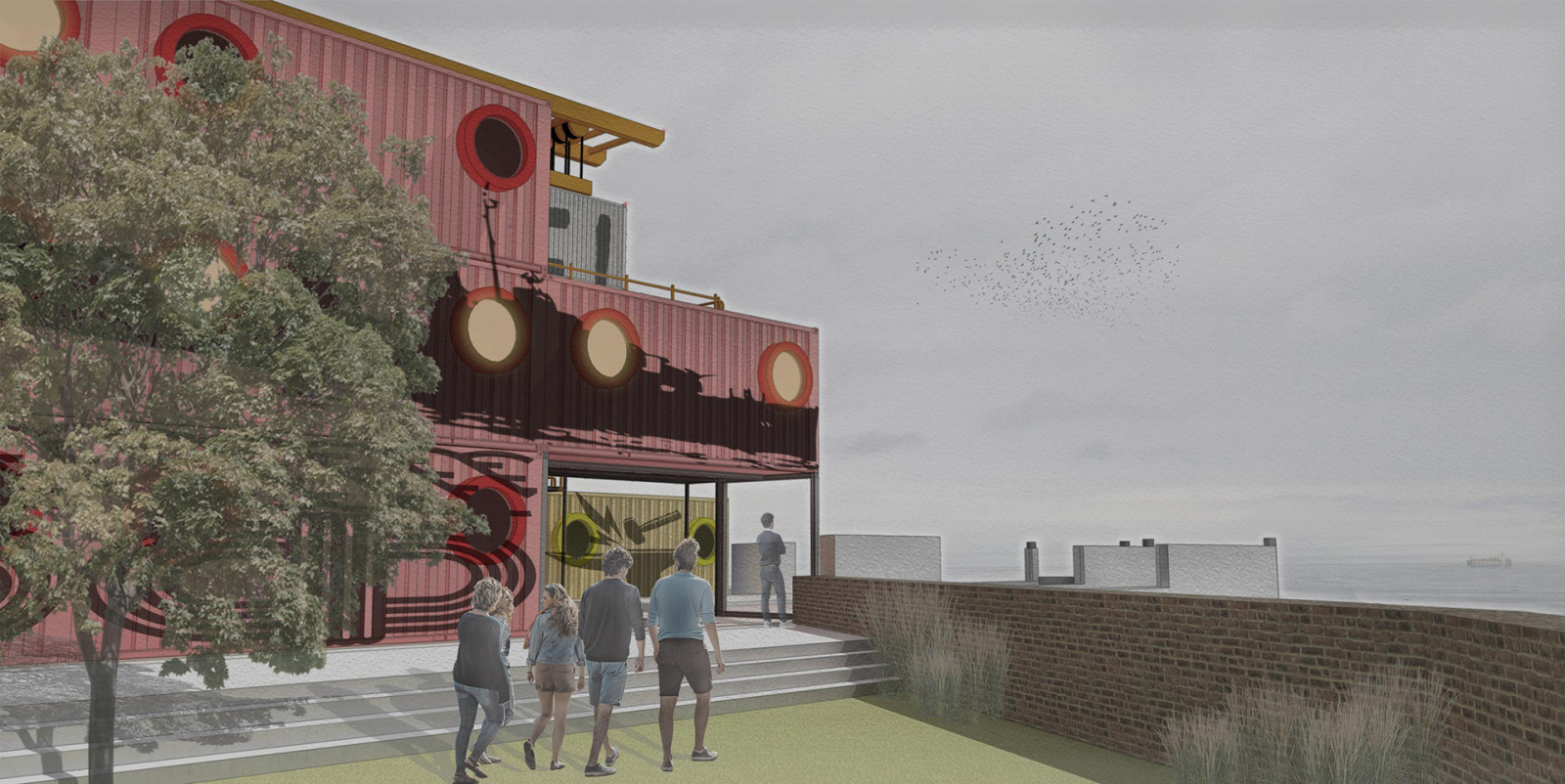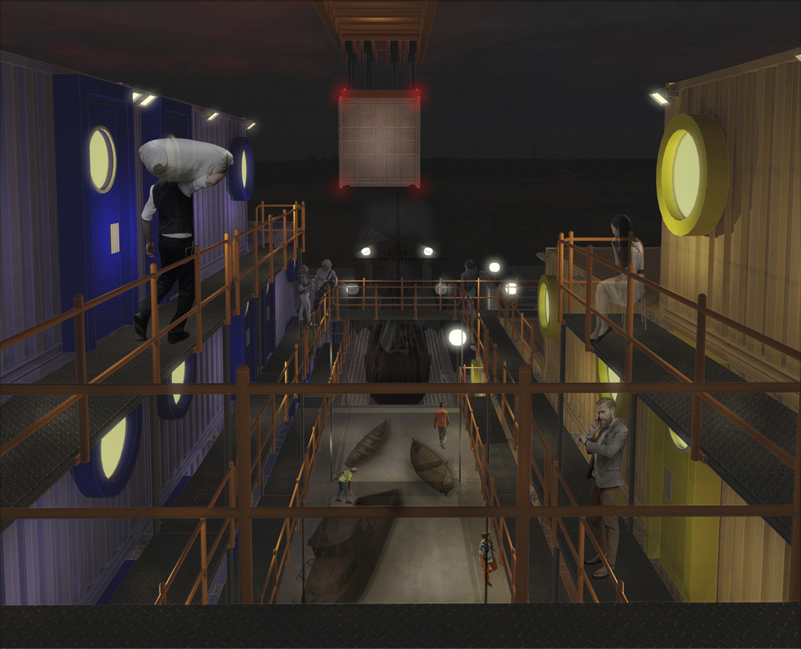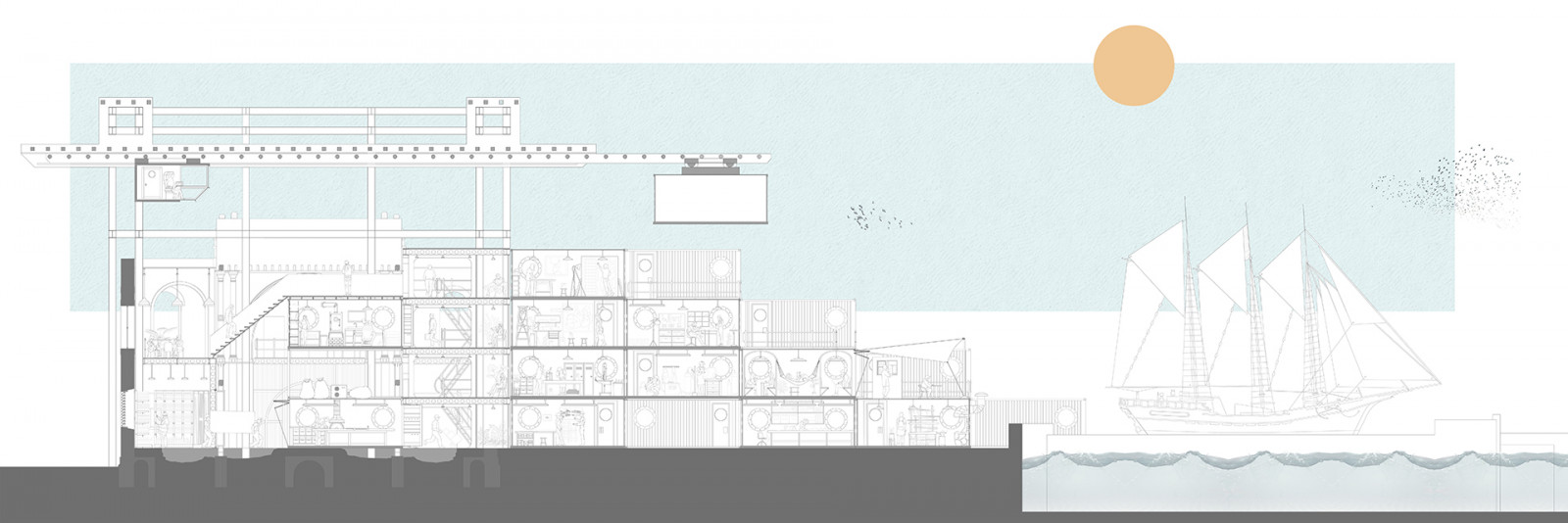 The makerspace is a flexible place that grows and shrinks in relation to the needs of the local economy. This is emphasised in two ways. The makerspace is organised as a mini-port; full of containers that hold studios and workshops. Secondly a huge-gantry crane redeploys the shipping containers, as and when they are needed. Its steel structure reinforces and restructures the existing building.