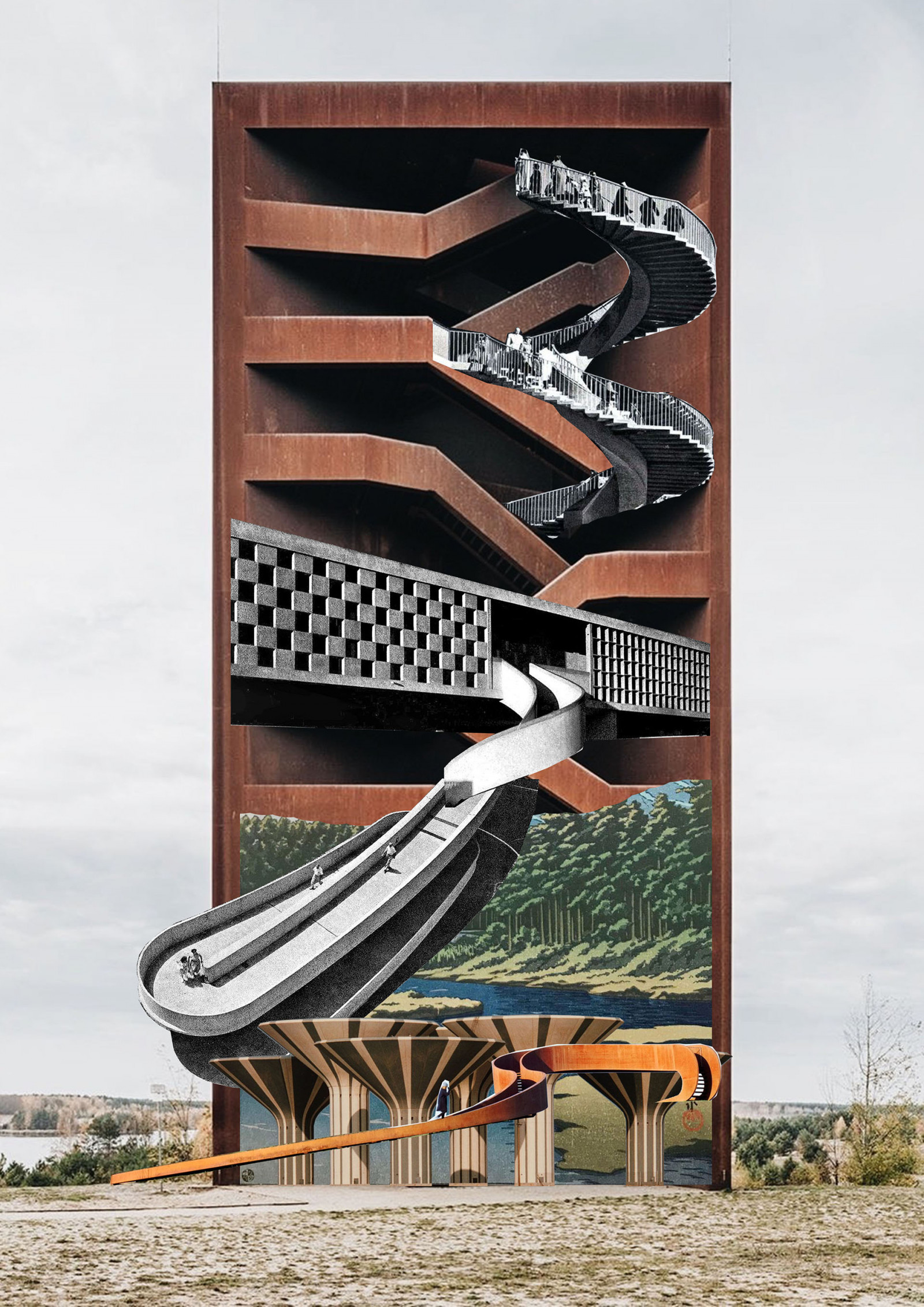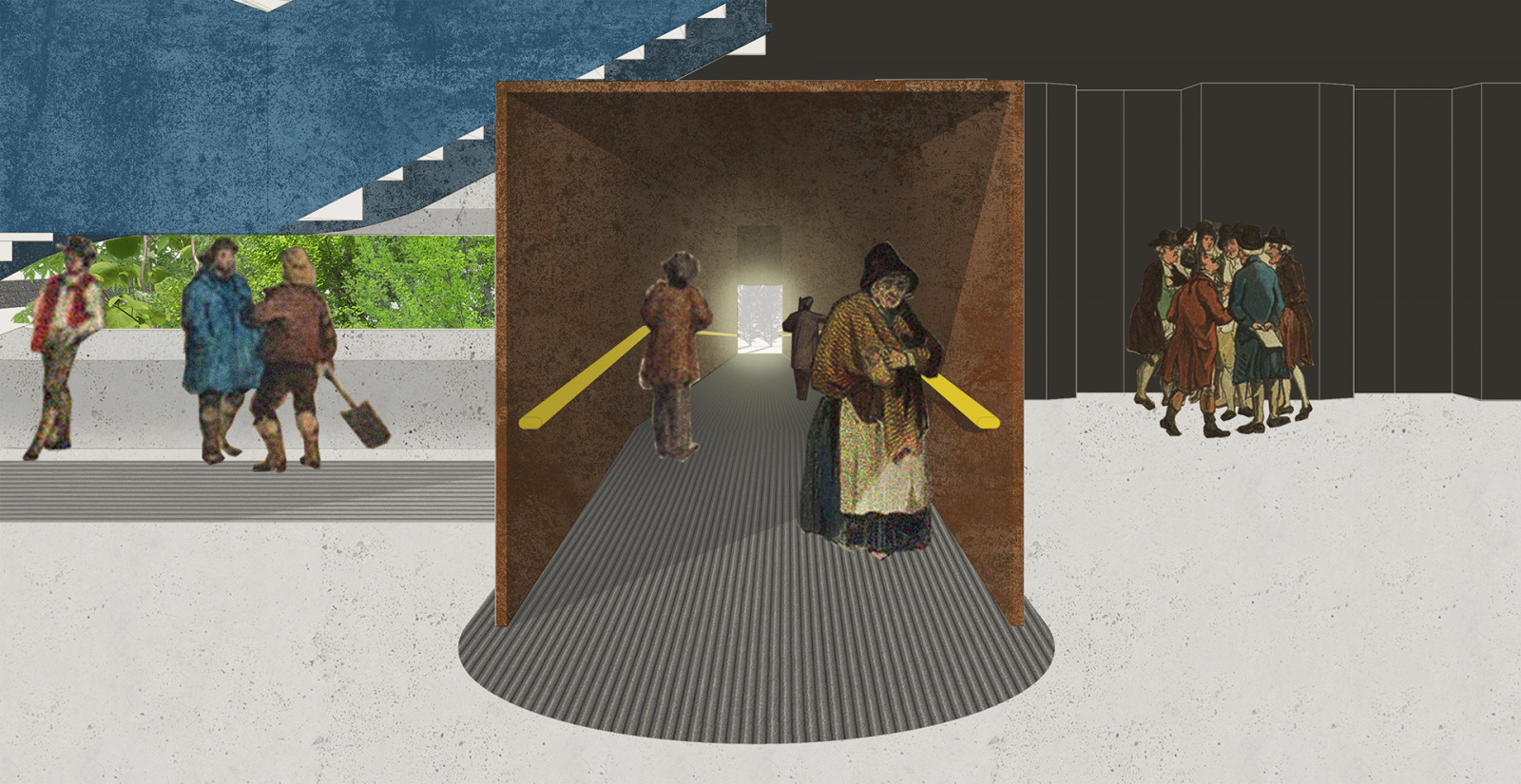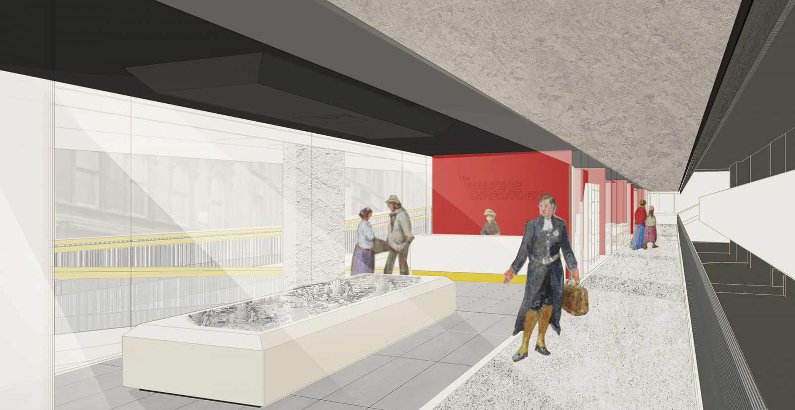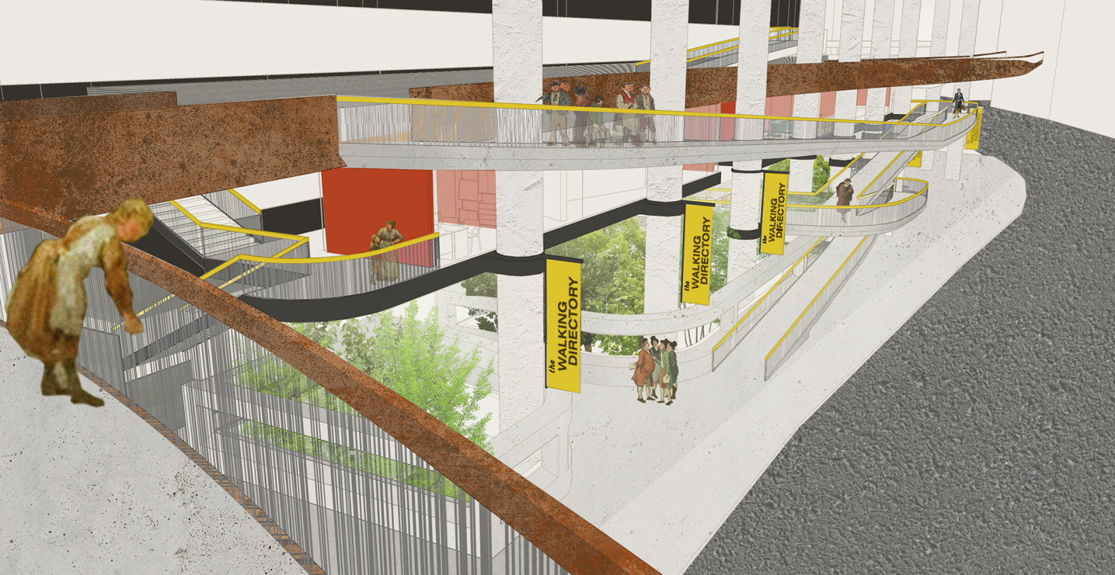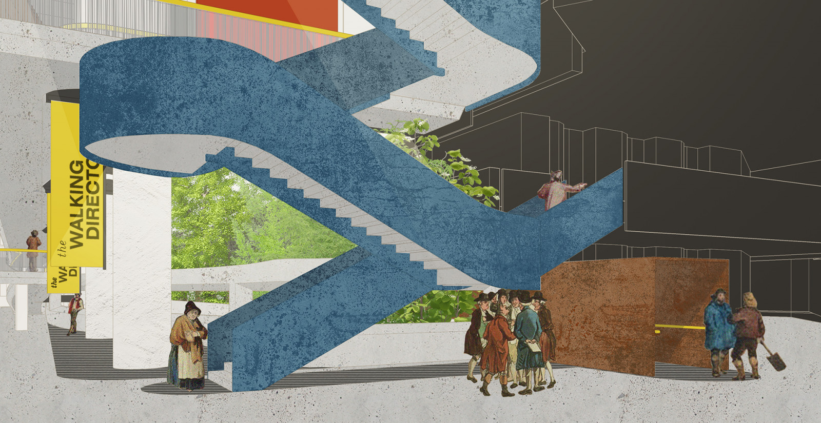 The experience of navigating through buildings on foot has become stressful and intense, inducing anxiety and other mental health problems. To counteract this urban tension, the Walking Directory provides respite and moments of calm, paired with shifting perspectives, so that the act of walking is transformed from one of stress to one of leisure and creativity. My design exaggerates the sense of movement through the city by extending the desire lines, and creating spaces where people move through spaces with a contrasting atmosphere. Light and dark, wide and narrow, high and low – the Walking Directory makes pedestrians aware of their own physicality and sense of movement in and around public space.