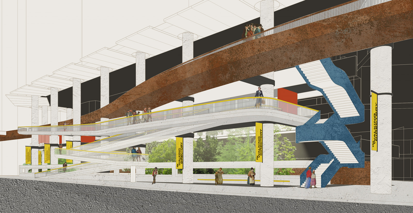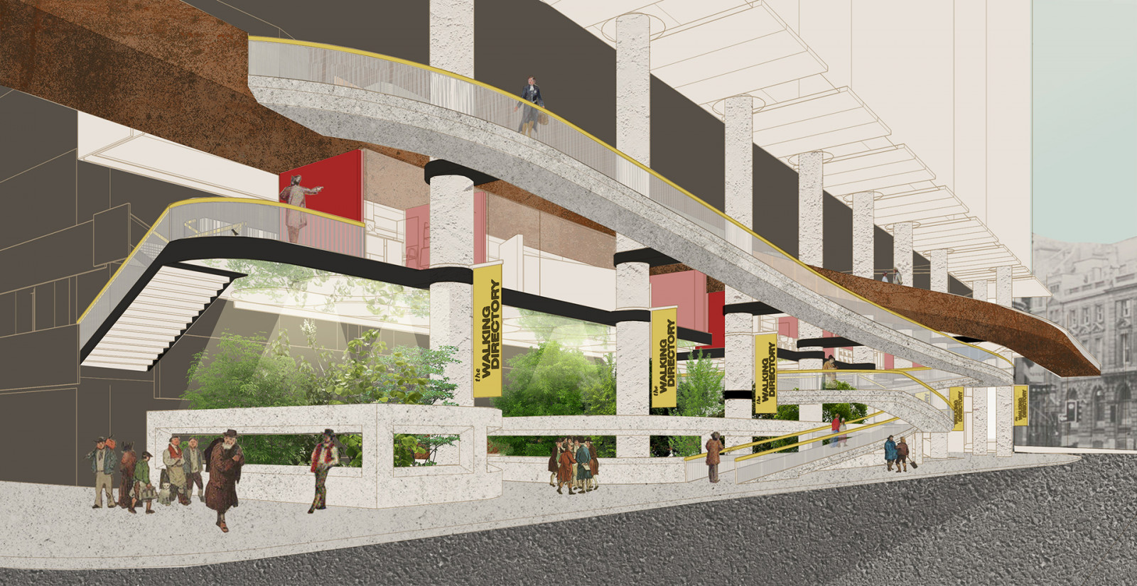 My proposal transforms the base of the City of London’s tallest skyscraper, 22 Bishopsgate, into an open public space that is devoted to stimulating new ways of exploring and navigating the city by foot. The Walking Directory is made up of a set of interconnected routes, with a public centre at its heart that will provide information about the hundreds of walking tours and hidden routes in the City. An exhibition centre, café and bookshop will support events such as Sculpture in the City and Open House. Below this, sunken into the ground, is a lush garden providing calm and serenity amidst the intensity of the tangle of routes that convey people in different directions. Above, flying ramps and walkways create novel walking experiences and desire lines that connect the building to the City’s existing pedway network at multiple levels.