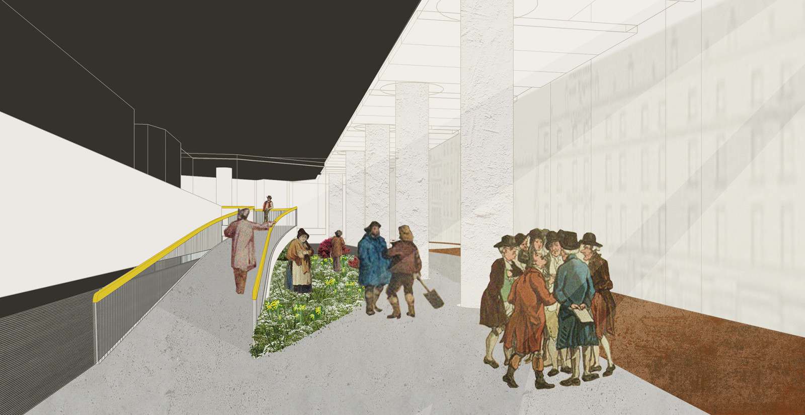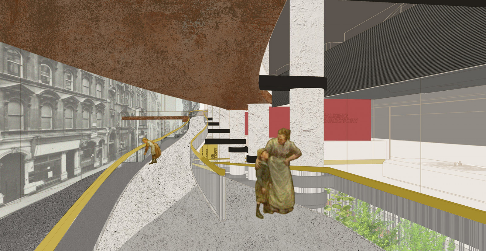 My design removes the existing glass wall of the entrance lobby to 22 Bishopsgate and allows the city to become more porous. By reviving the London Pedway scheme, the site is connected with key destinations such as train stations and green spaces. A highway at the second floor level alleviates pedestrian traffic during rush hour and provides alternative experiences of mobility.