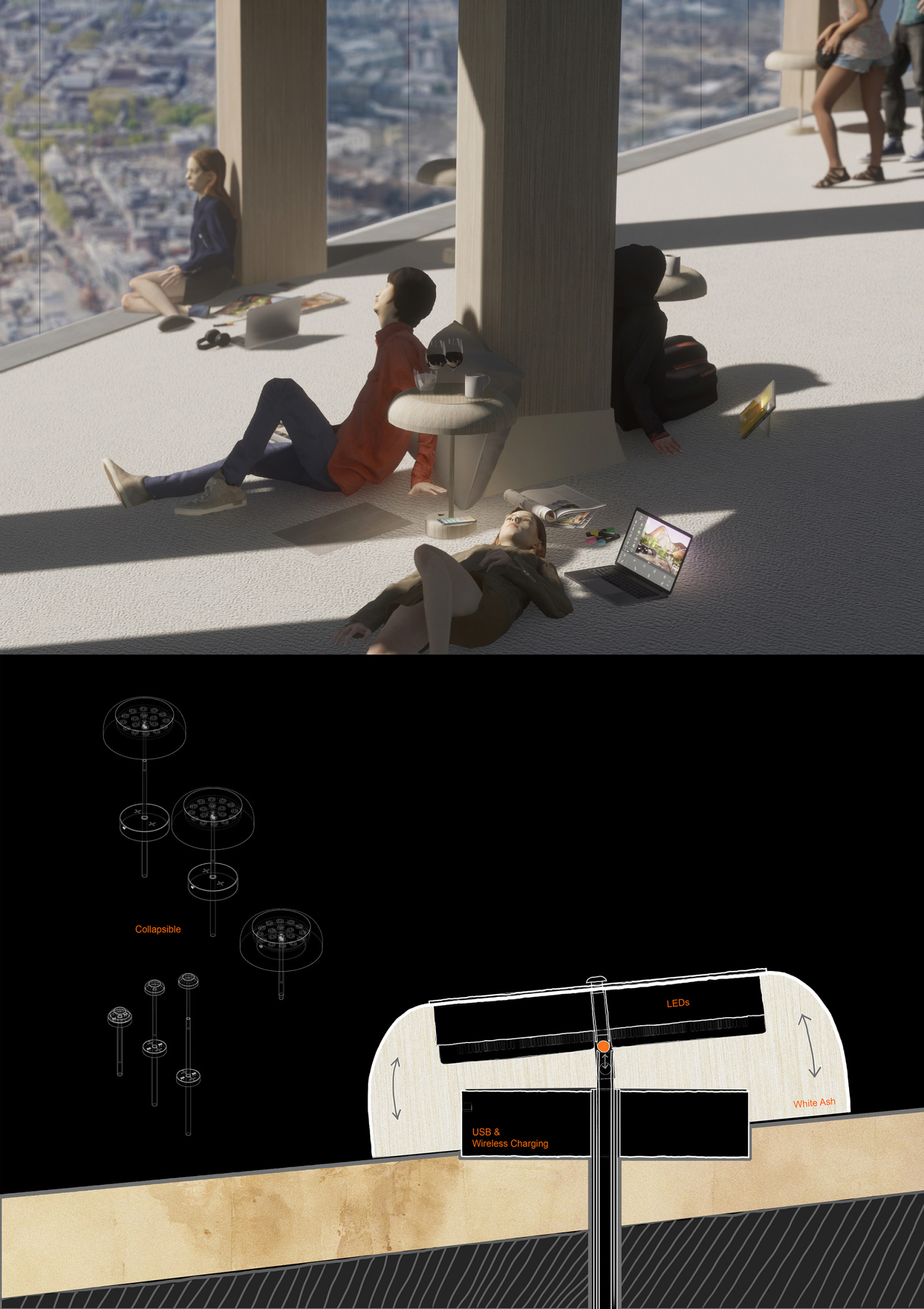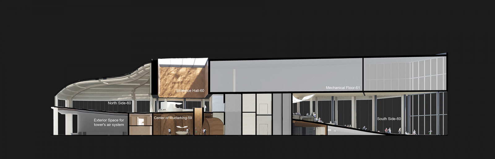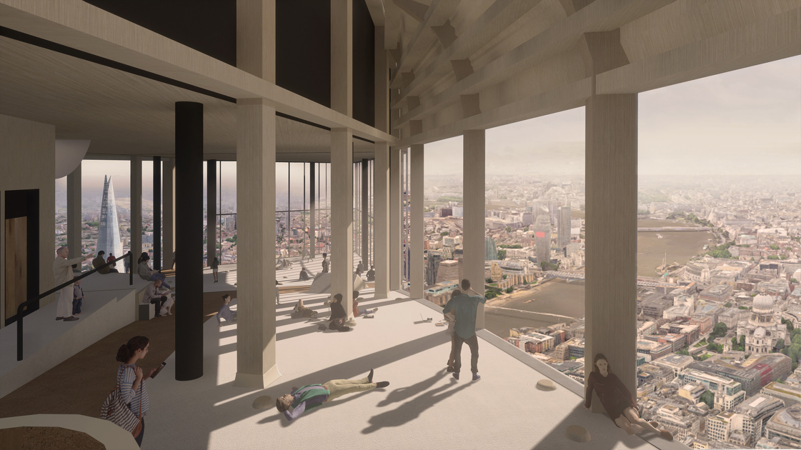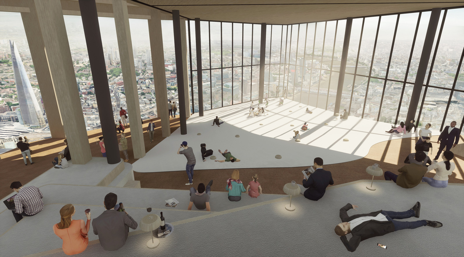 The main space is an open Terrain on the top floor of the tower with spectacular views. Contrasting the confined public spaces of the City of London, the Terrain is open and allows people to move around freely. Its topography echoes the riverbank of Thames, which boosts London’s commercial trade and made the City of London great. Stripped of human intervention, the Terrain reveals the natural incline in the landscape as the City falls towards the river. This creates a tactile relationship between people and the land.