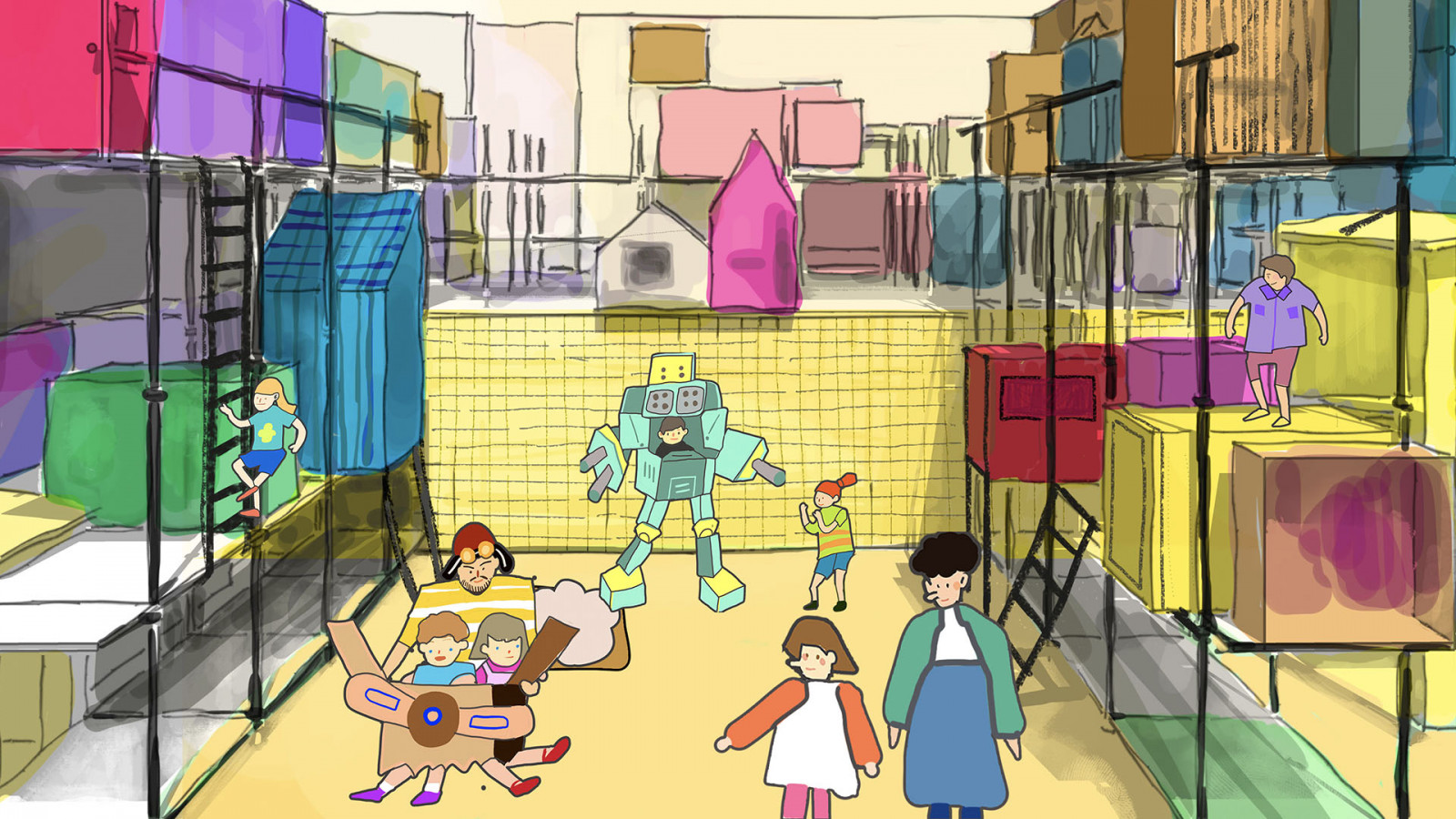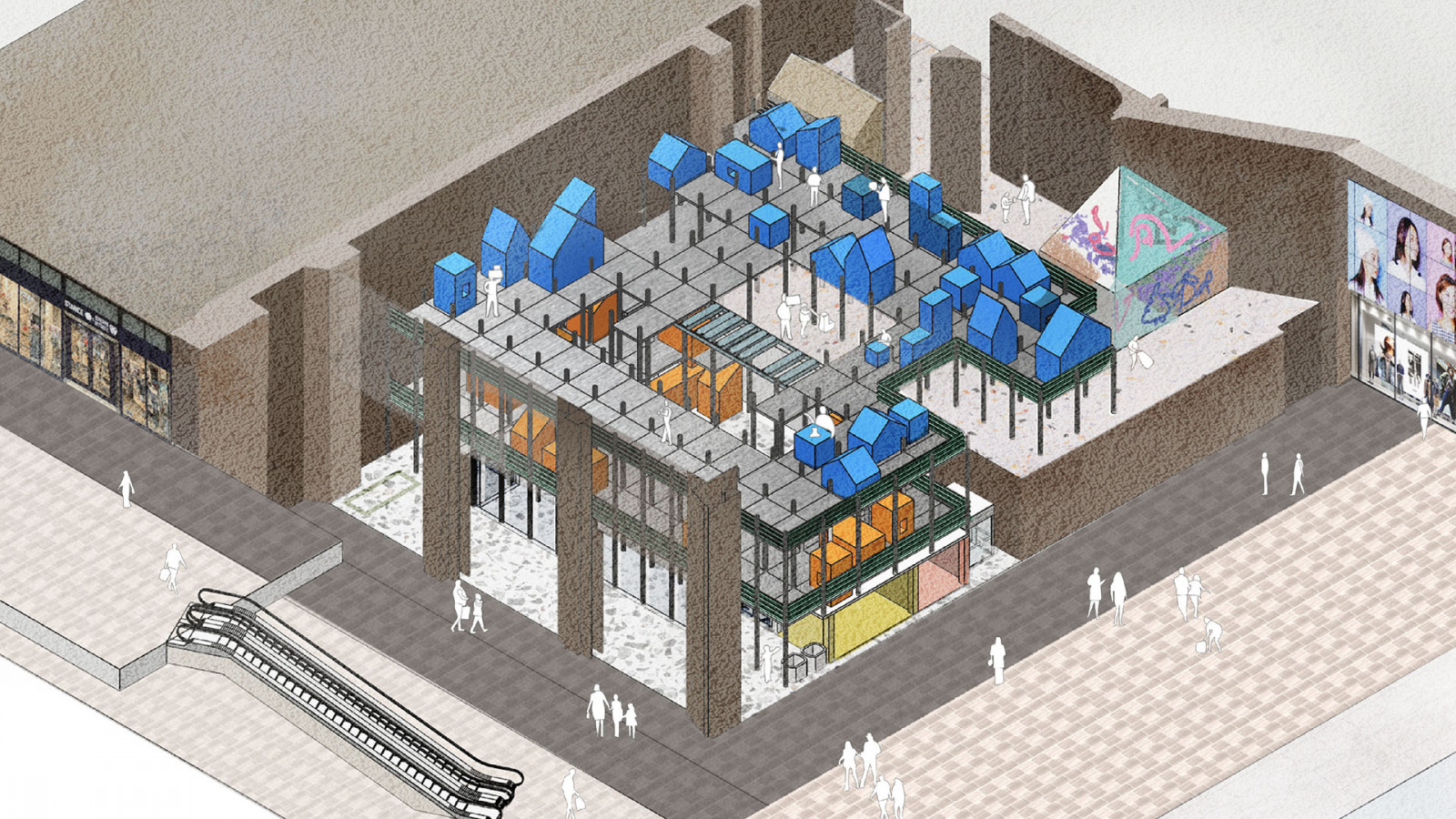 Inspired by the #girldadchallenge on social media during the UK national lockdown, a new speculative play centre emerges in the Grosvenor Centre Northampton, providing spaces for children and fathers to build and customise sheds, complete unfinished bridges and explore innovative materials made from recycled waste. A multi-levelled open platform encourages children to reimagine the shed and learn by solving spatial problems, whilst a series of surrounding social spaces for families provides support for fathers, opportunities to learn new skills and watch the shed world evolve over time.