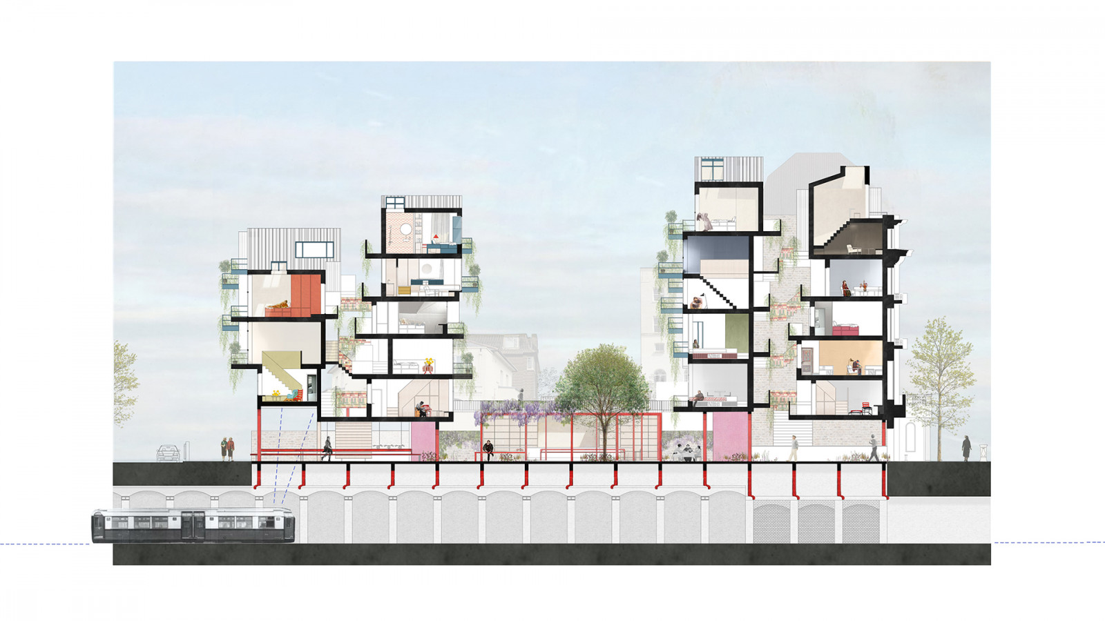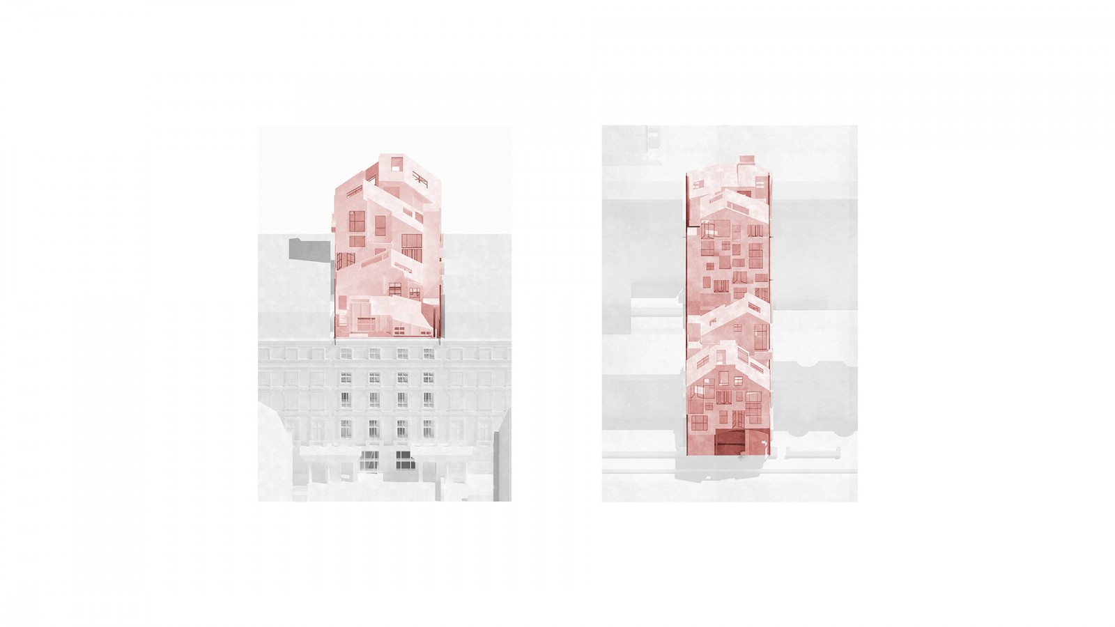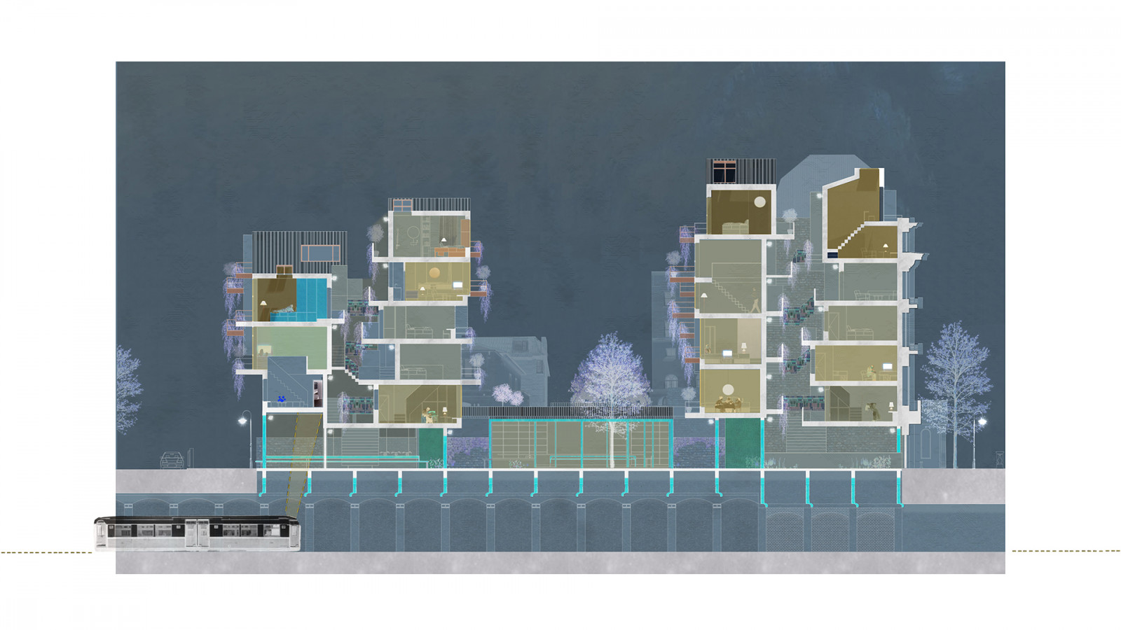 The three LGBTQIA+ housing associations TONIC Housing, Stonewall Housing and Opening Doors London have recently joined forces to research the well-beings of the +55-year-olds within the LGBTQIA+ community in London. This is recognised as a group which feels particularly isolated, overlooked and not belonging in regular society. In response to this research, I have designed housing for this particular group of people with the aim of bringing them closer together as a community and kinship family but also to make them visible and part of the city fabric.