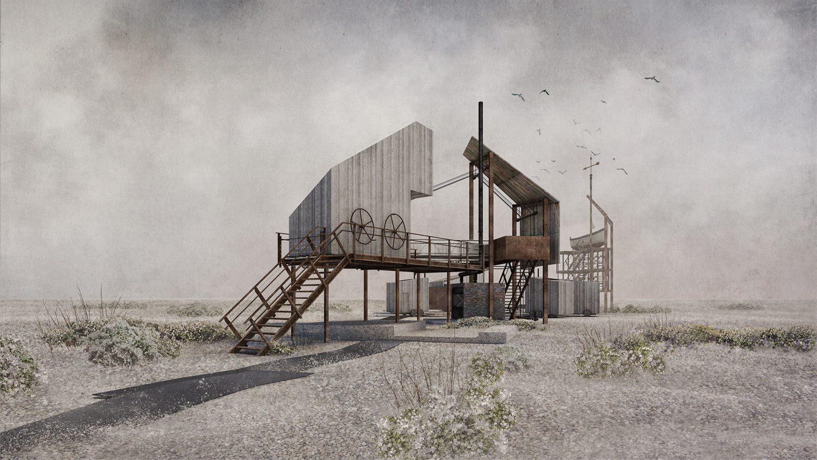 Dungeness Assembly is a gathering space that unifies and connects people through local culture and heritage. The place is also an assemblage of structures, spaces and interiors that relate to Dungeness, demonstrating contrasts such as enclosed/exposed, heavy/light and safe/risky. By highlighting these contrasts I hope to encourage users to feel and participate actively with their surroundings.