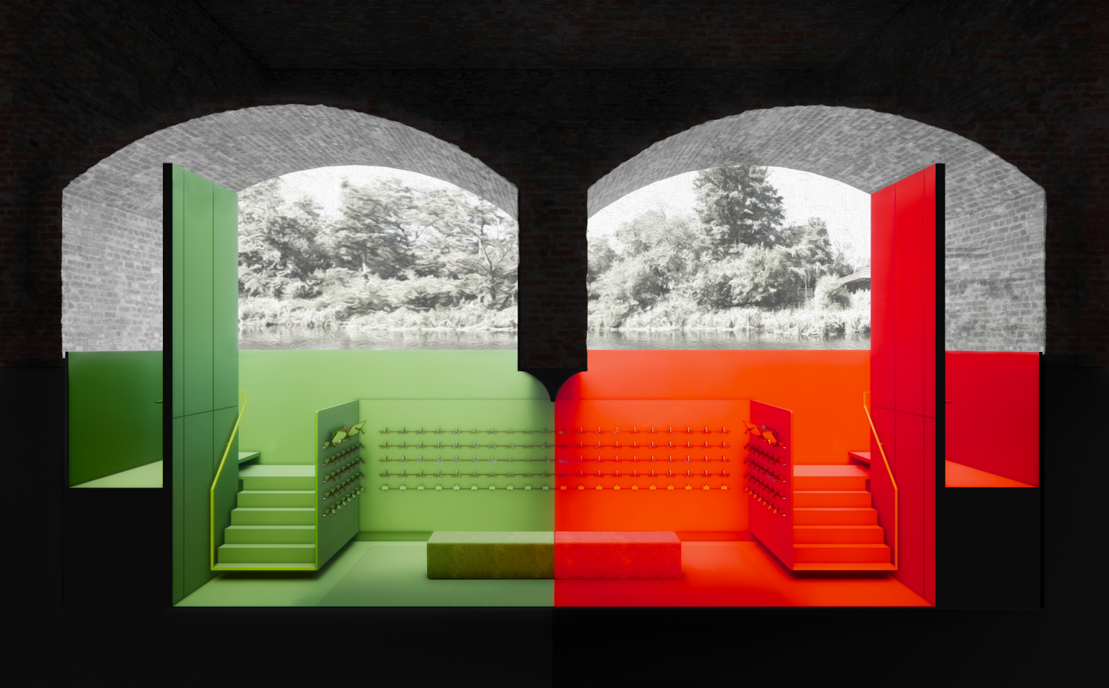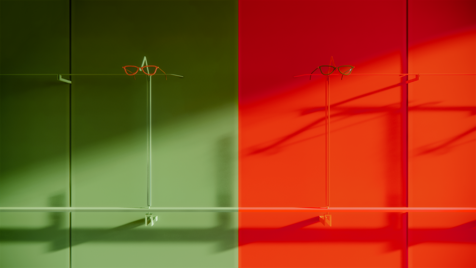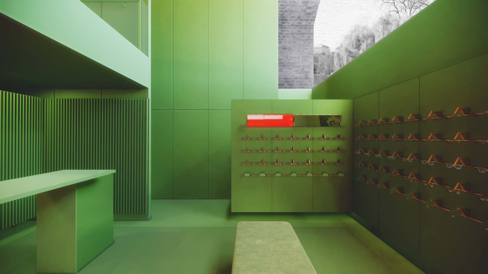 It is unusual for us to experience spaces that employ a singular bold colour in a playful theatrical manner. The inspiration for this project is the red-green duochrome optical test that is used to determine the patient’s strongest eye. Investigations into colour theory led to Johannes Itten’s work regarding the simultaneous contrast of complimentary colours where red and green have an equal ‘50/50’ relationship. The site comprised of two equal and adjacent railway arches that also had a ‘50/50’ relationship and the opportunity to create a rather surreal pair of singular monochromatic spaces presented itself. To realise this aim a symmetrical scheme organised around the central axis between the two arches has been created. As customers journey from the ground floor entrance to the basement showroom and consultation spaces a carefully crafted composition of vertical planes of various heights conceal and then reveal vistas and views to manipulate the user’s sight lines and focus as they circulate through the space. Early experiments developing structures to display spectacles led to the creation of a modular display system that can be adapted to be either wall or handrail mounted. Using this system identically coloured frames are displayed against contrasting red and green backgrounds that test the customer’s visual perception.