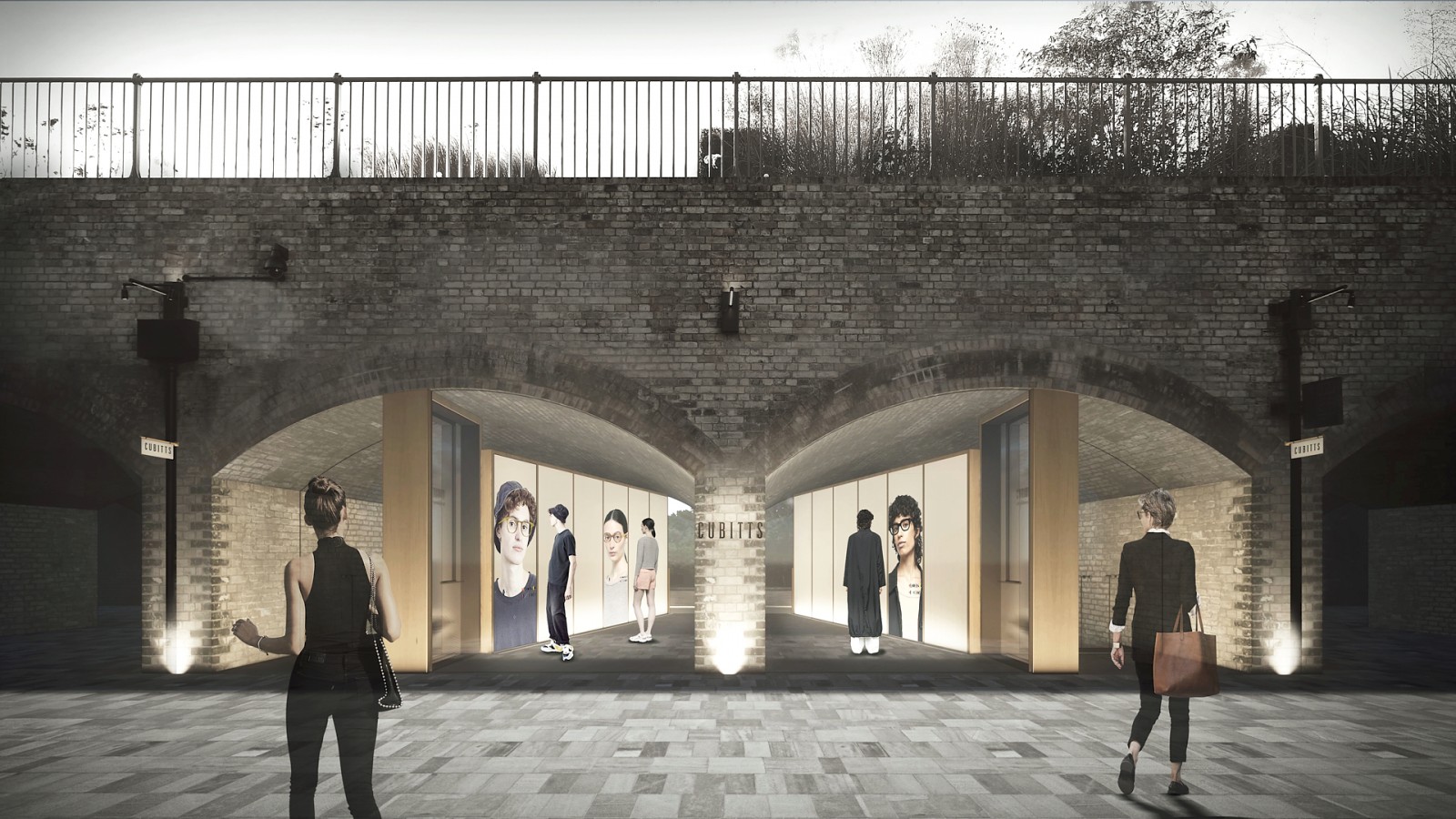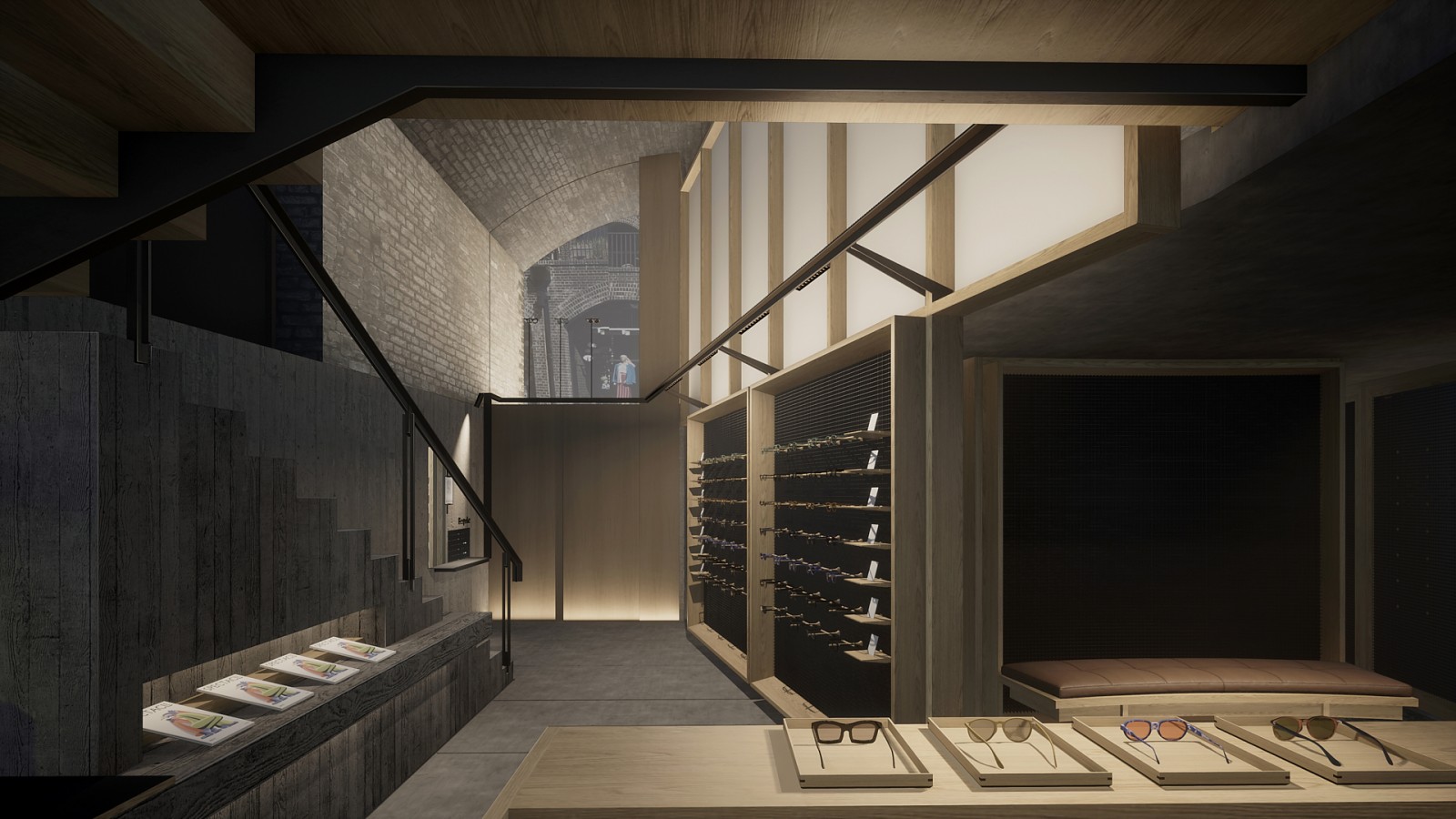 This project creates an optician’s shop for Cubitts within a pair of railway arches at Coal Drops Yard, Kings Cross, London. Cubitts is a small independent spectacles retailer based in Kings Cross whose ‘butterfly’ shaped logo is derived from a structural rivet employed by the Cubitt brothers in the original construction of Granary Square. At ground level the scheme employs a game of perspective where passers-by can perceive a three-dimensional spatial realisation of the Cubitts logo when two rectangular vertical planes are viewed from a particular angle. As such the scheme plays around with viewpoints, sight-lines, eye-levels and vanishing points as elements that are part of how our eyes help us experience architectural space. The basement showroom, workshop and consultation spaces employ a gridded display screen that cleverly uses the rules of perspective to become more open when viewed from a distance and more closed when viewed up close. The grid module supports a flexible spectacle display system where components effortlessly slot into the screen. I hope you enjoy looking at the project as much as enjoyed creating it!