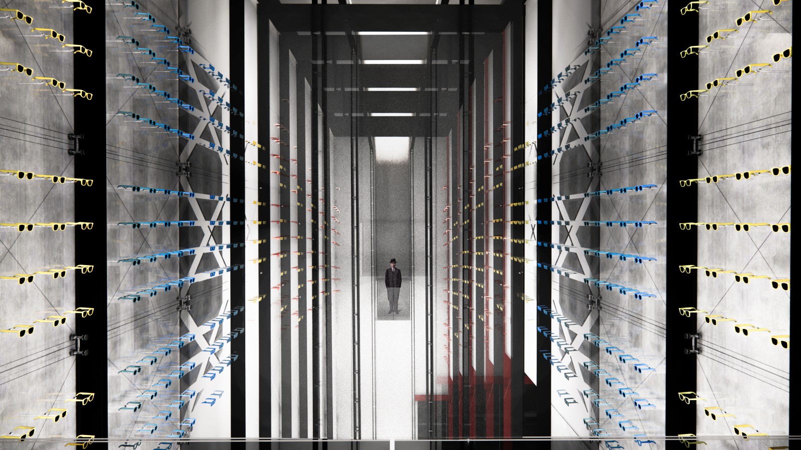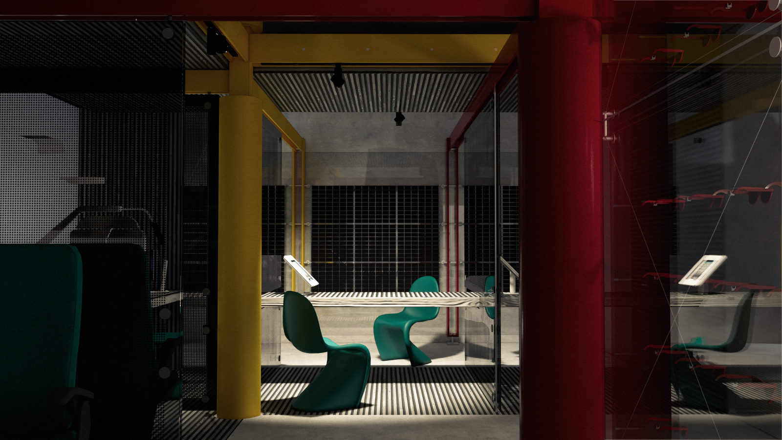 This project creates a fantastical vision of what an optician’s shop could be. Learning from Cubitts’ existing shops, where storage systems are often presented as an integral part of the interior, initial research work explored the characteristics of an archive and established the following criterial attributes; ‘categorisation’, ‘repetition’, ‘grid’, ‘infinite’, ‘mechanistic’ and ‘subterranean’. The design proposal set about creating an interior environment that delivers these attributes. To this end the ground level of the existing site is left largely untouched save for the introduction of a gridded glass floor that reveals a vast underground void filled with an archive of spectacles displayed against mirrored panels that reflect the collection into infinity. Adjacent to the glass floor, an enigmatic mirrored cube houses a lift that transports visitors to the shop floor level deep beneath the earth’s surface. As customers descend in the lift, they are taken on a journey through Cubitts vast collection of spectacle frames until they arrive at the basement level where the display presents the spectacles for sale arranged around three sides of a square floor space. Wrapped around the shop floor is an ‘L shaped’ arrangement of spaces that contain all the support facilities for the opticians. The design language for the interior is derived from an industrial ‘hi-tech’ aesthetic that uses powder coated metal, mirror and glossy acrylic panels to this end. The scheme employs bright primary colours inspired by the paintings of Mondrian and these colours are used to ‘code’ elements of the scheme. A key component is a red column that stretches from the basement to the ground floor level and establishes the centre point of the scheme.