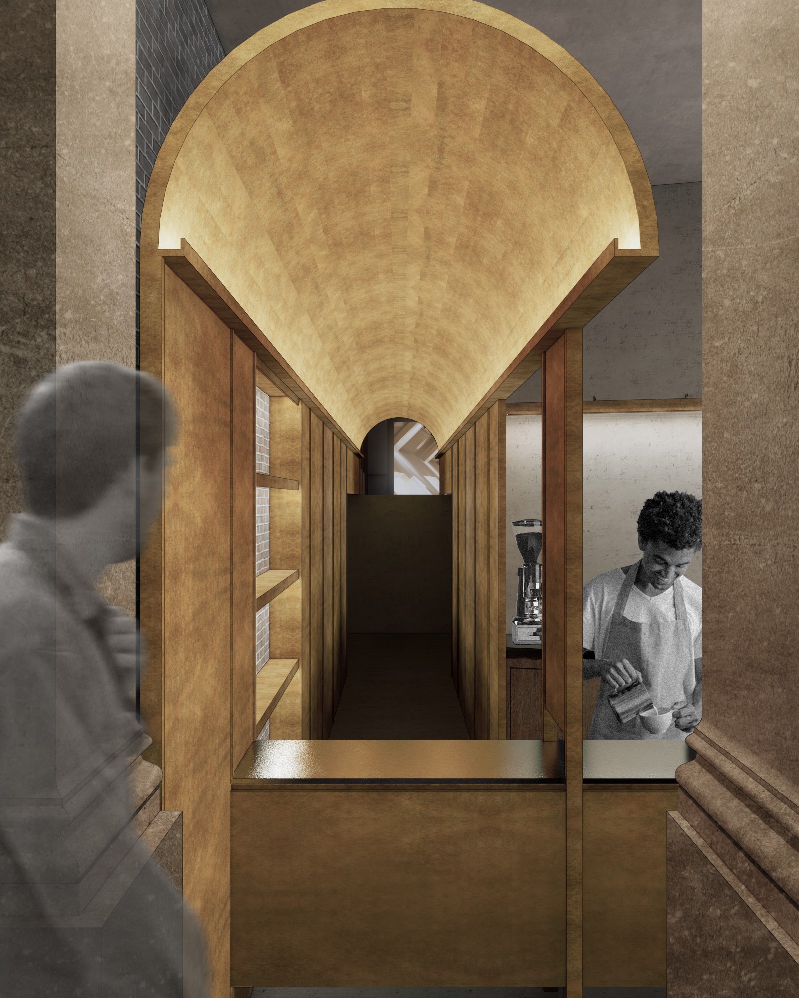 Taking advantage of the existing building, the enclosed central area is used as a sunken square, attracting visitors from the street to the square, then dispersed into other functional Spaces of the project. Wings is an open to private transition from low to high level. Horizontal lighting and ground decoration, vertical structure will be the design language of the whole space. openings and spatial forms are designed to guide people into the next space. Retaining the ceramic on the original building wall forms a new dialogue with the new timber wall and concrete.